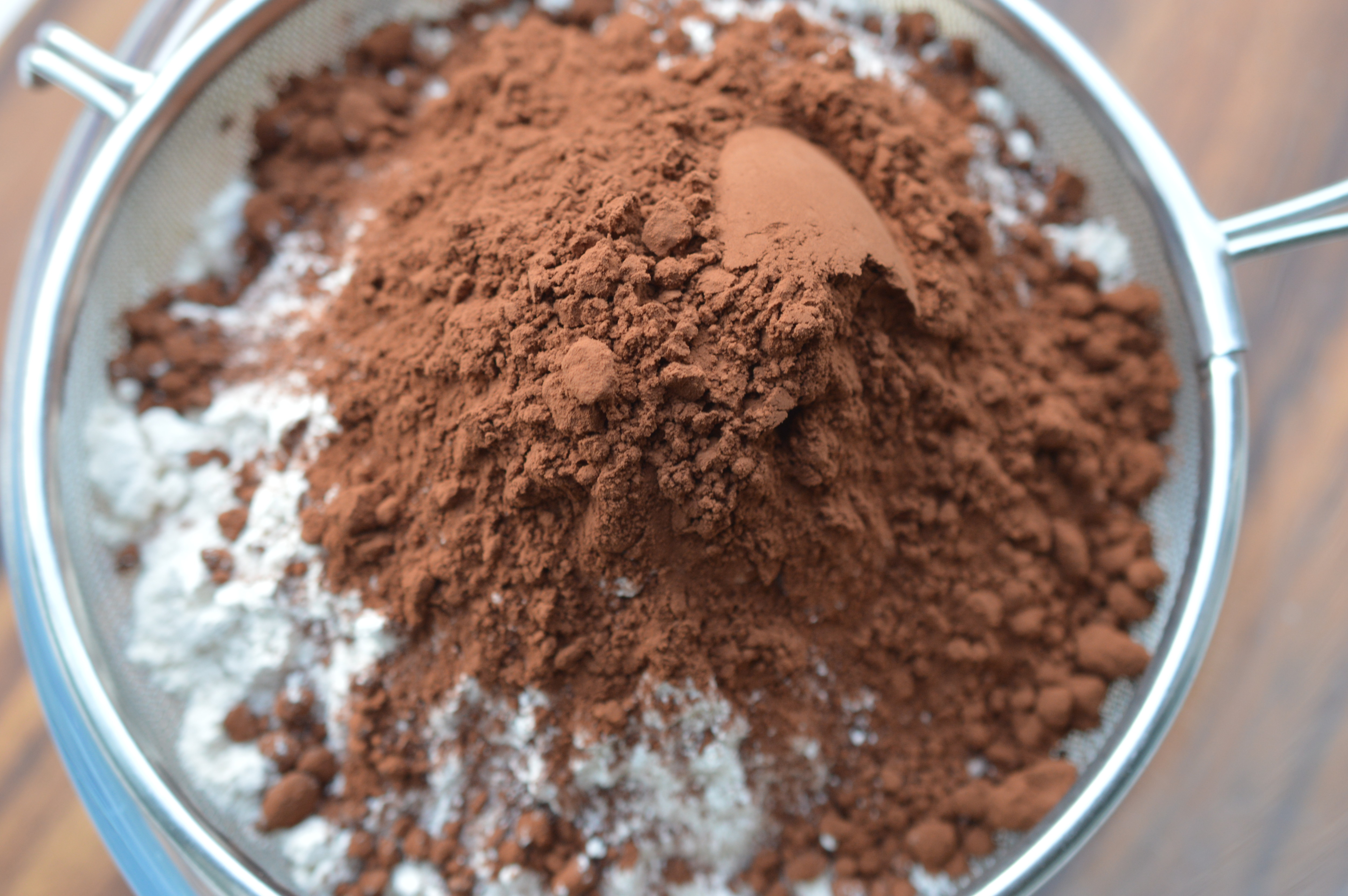 The flour and cocoa powder need to be sieved together. Cocoa powder is prone to lumpiness and you may as well get the two combined at the start.