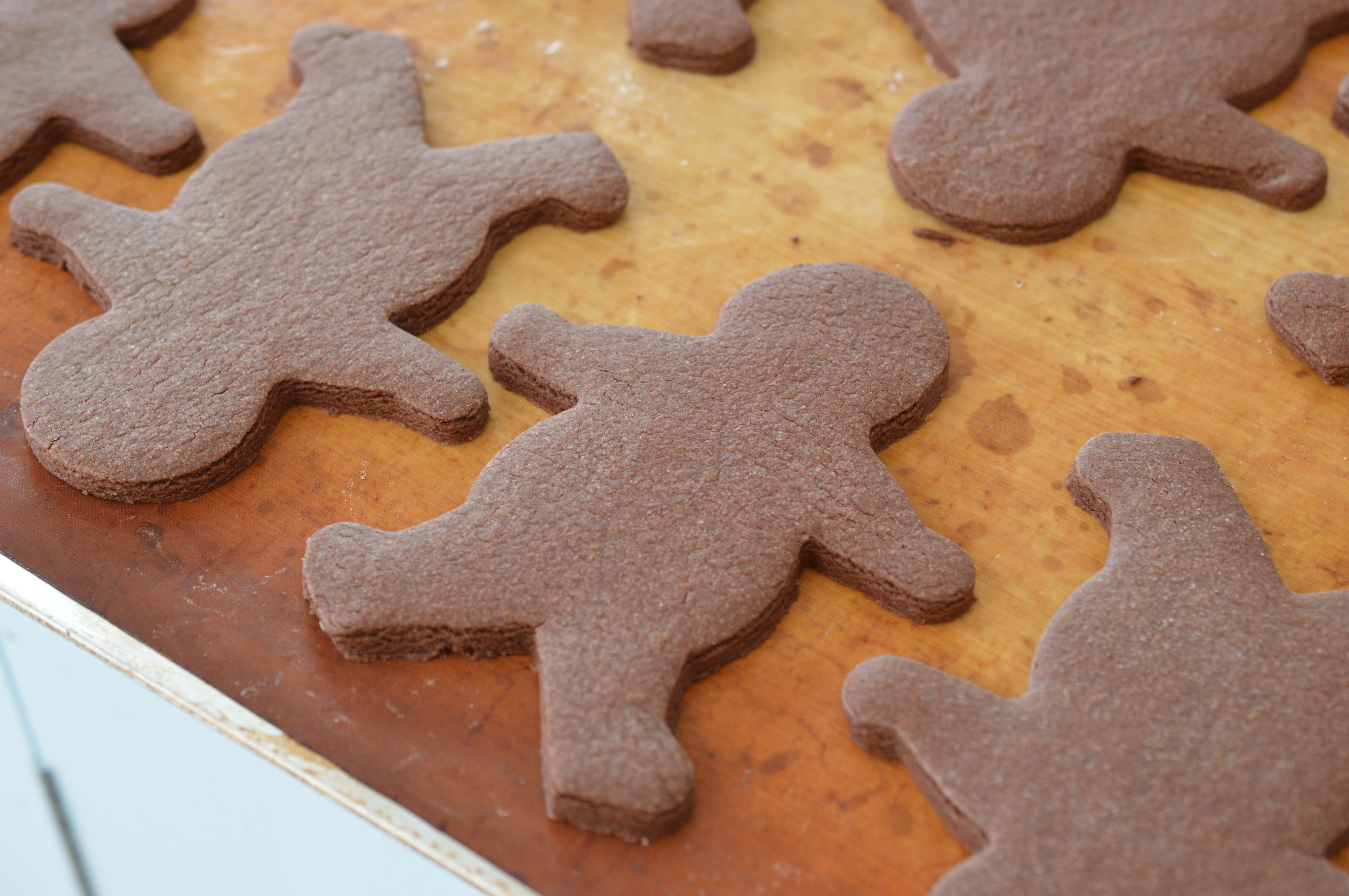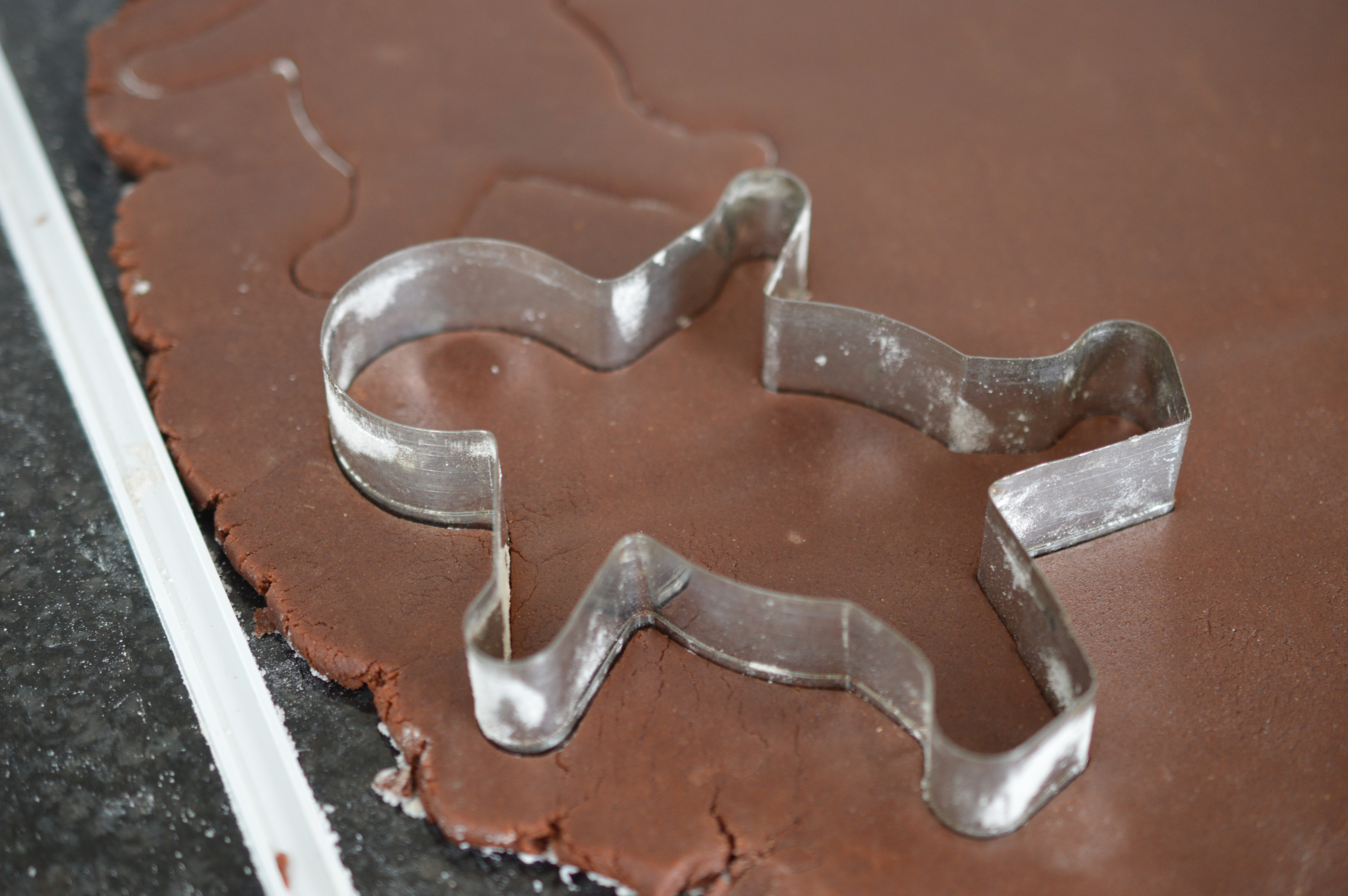 Use a floured cookie cutter to cut out the ‘gingerbread’ men. If you give the cutter a little wiggle it helps when you lift your cut-outs to your baking tray.
