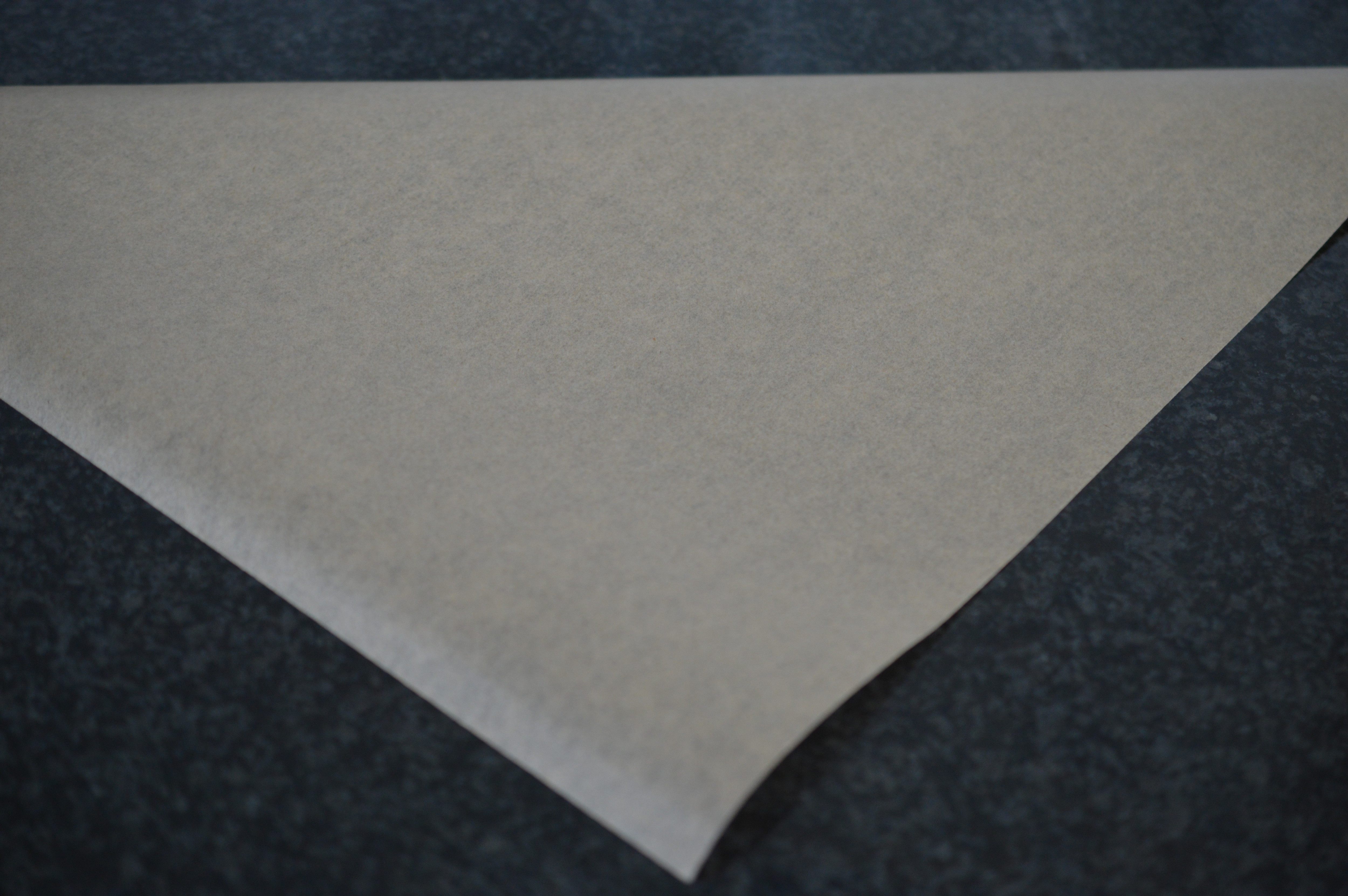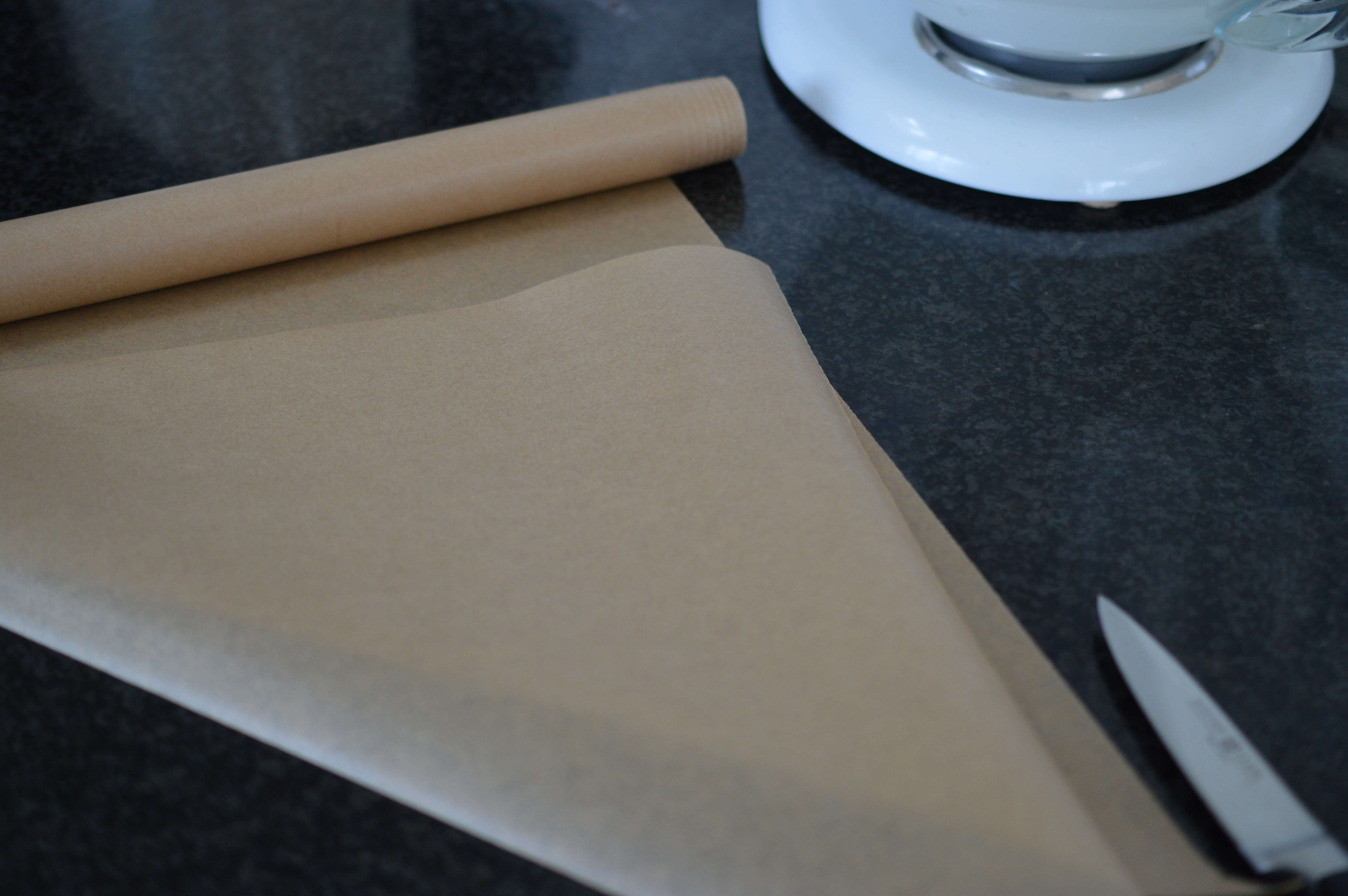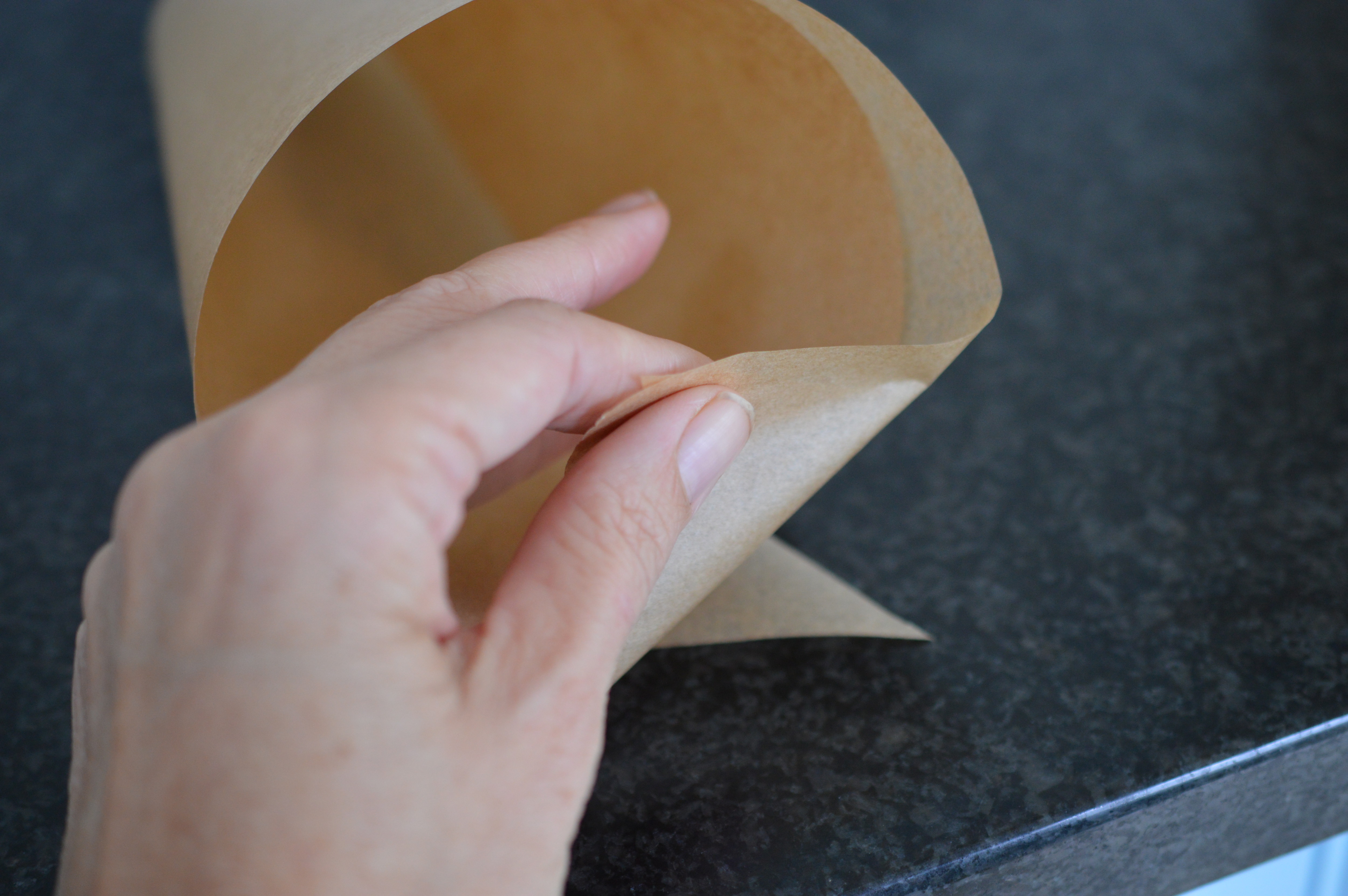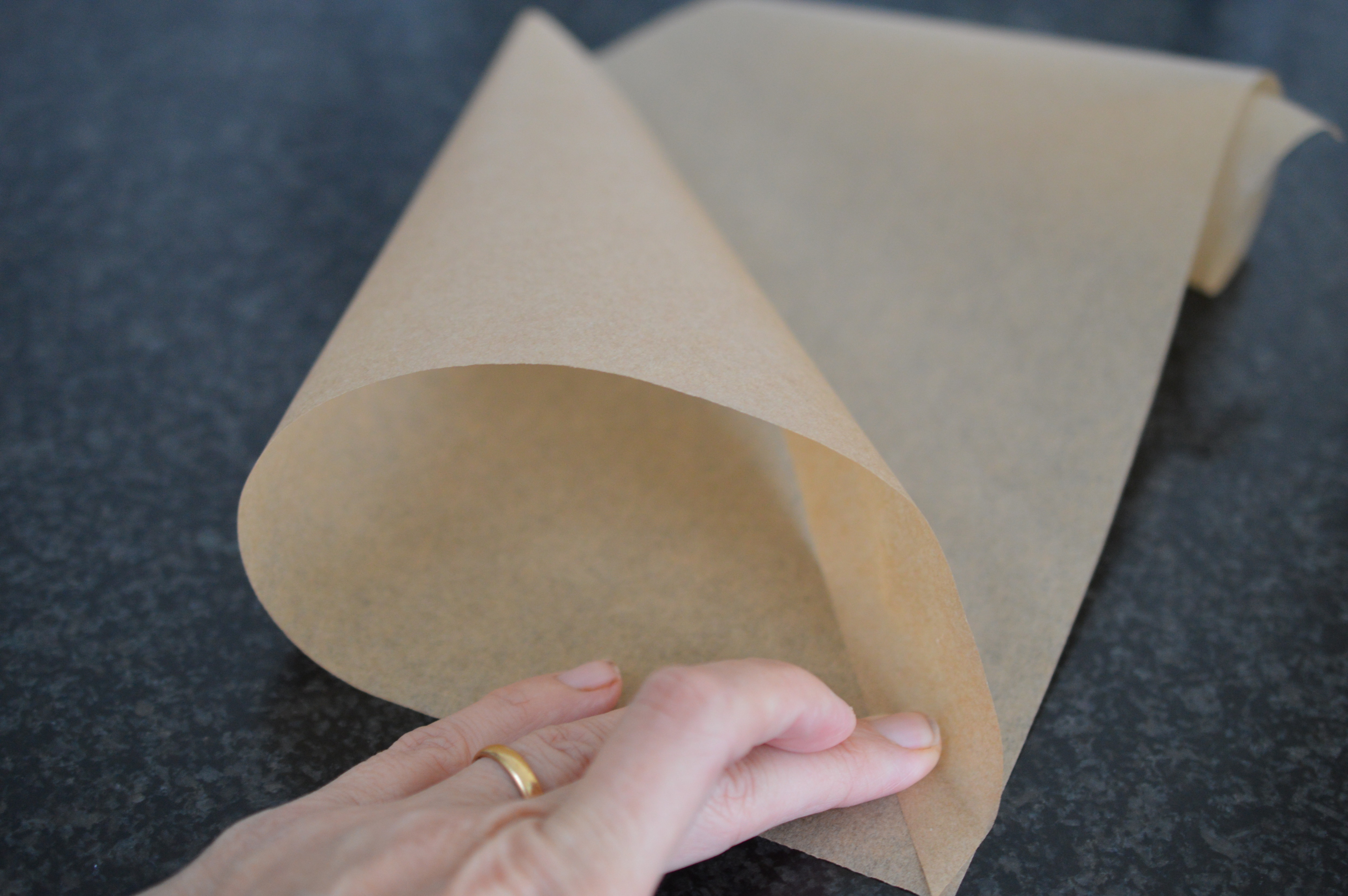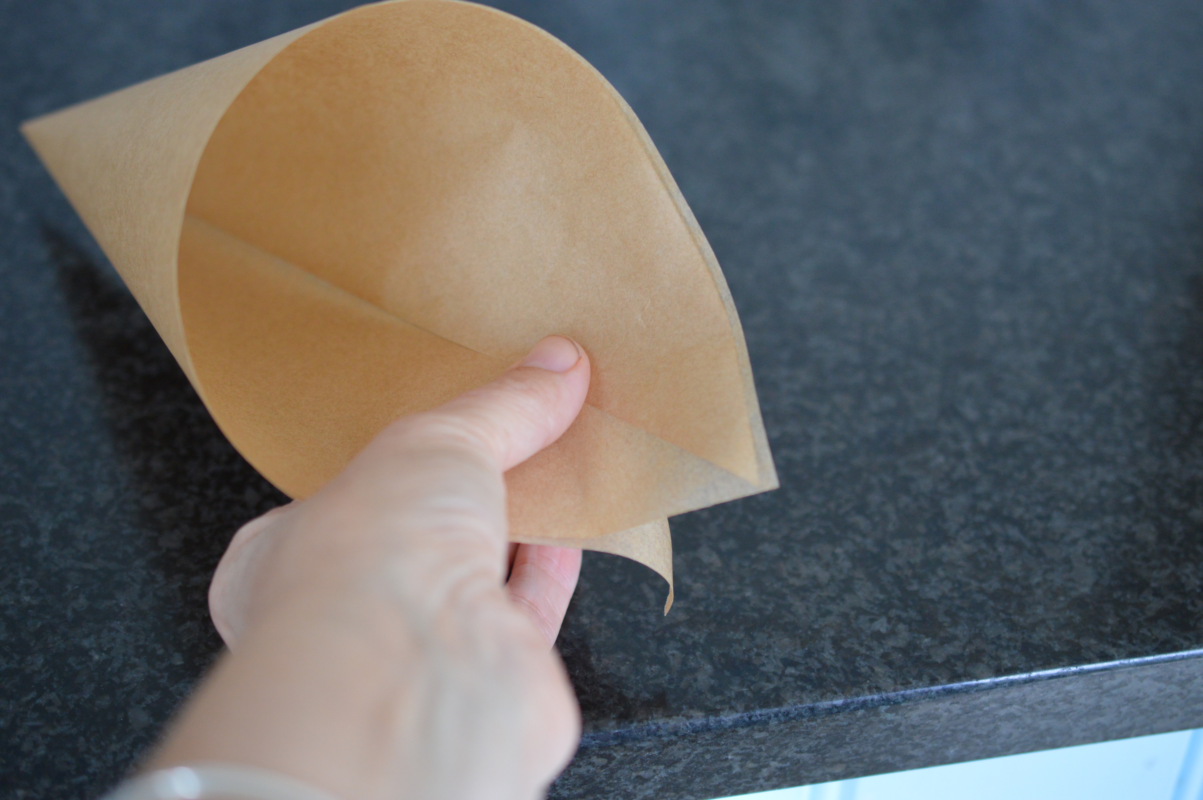Making your own paper piping bag saves lots of money. Fold one corner up diagonally and cut in half. I use a knife, sliding it along the sharp crease so I have a clean cut.