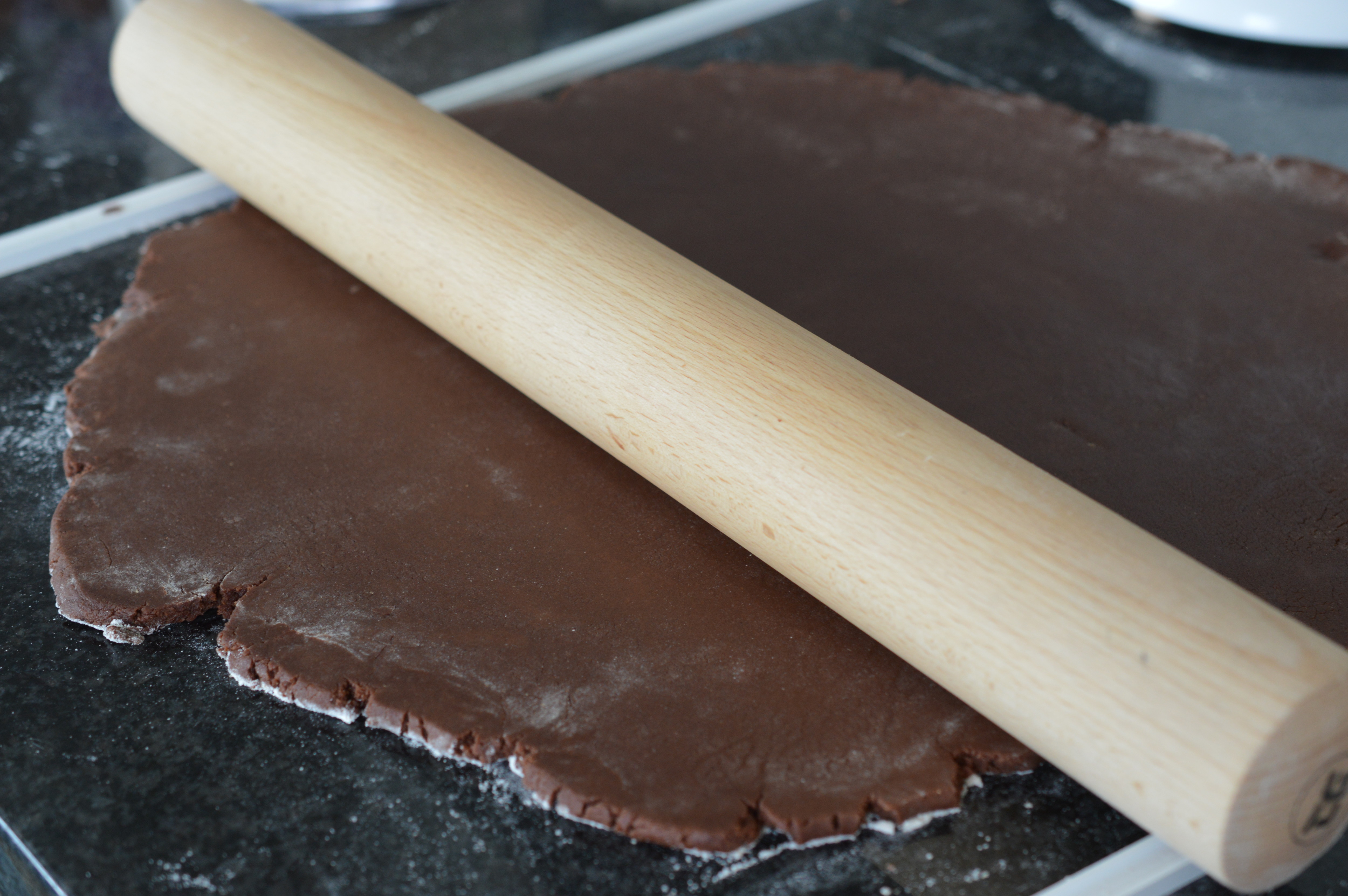 Remove from the fridge and briefly knead until there are no cracks. Roll out the dough to a thickness of about 4mm. I use marzipan guides. If you are finding your dough sticky to work with you may find it easier to roll between sheets of cling film or baking paper.