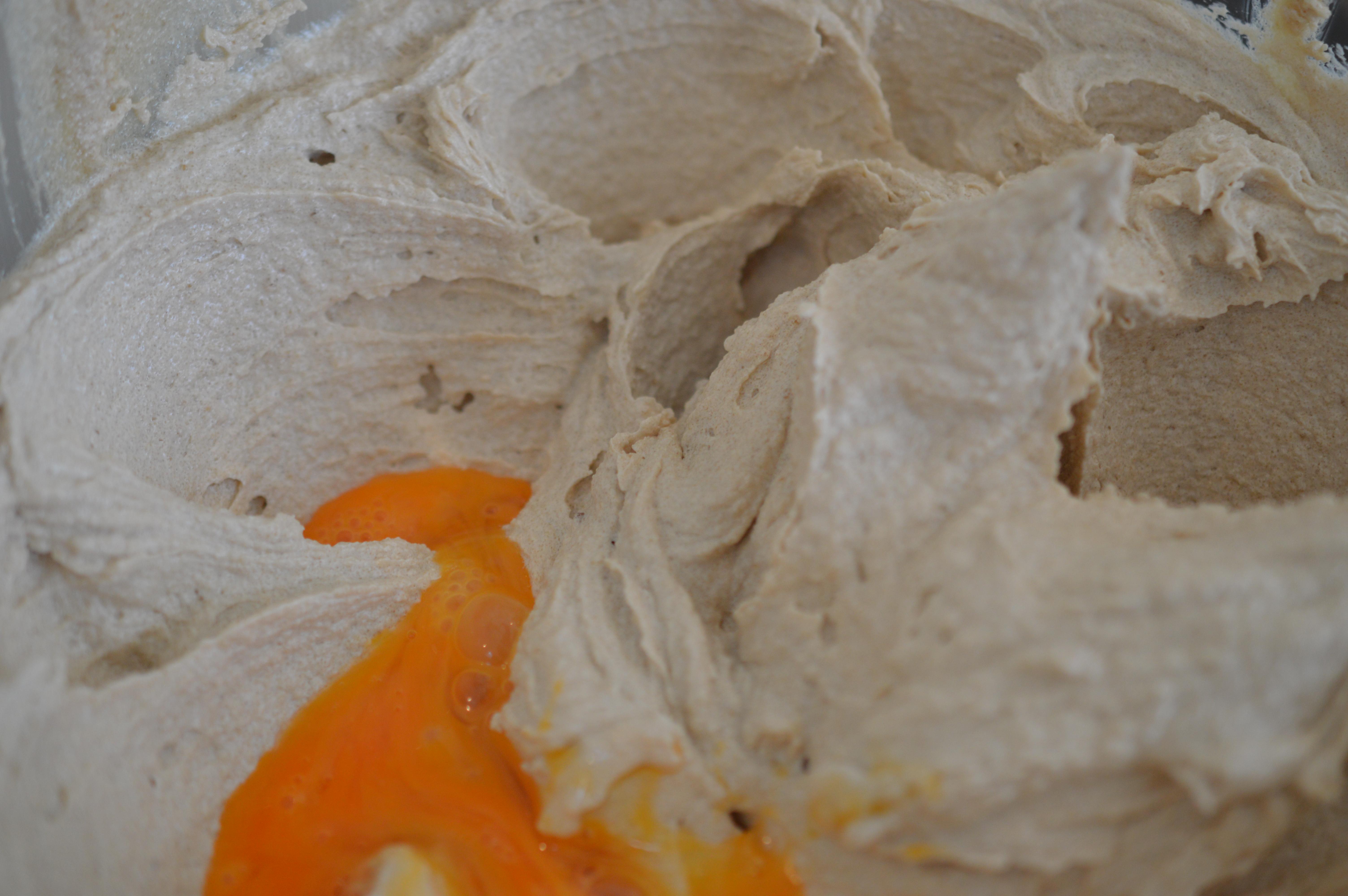Beat the softened butter and caster sugar together until light in colour and fluffy. Then slowly add the beaten egg, beating together until extremely well combined. Add the pinch of salt.
