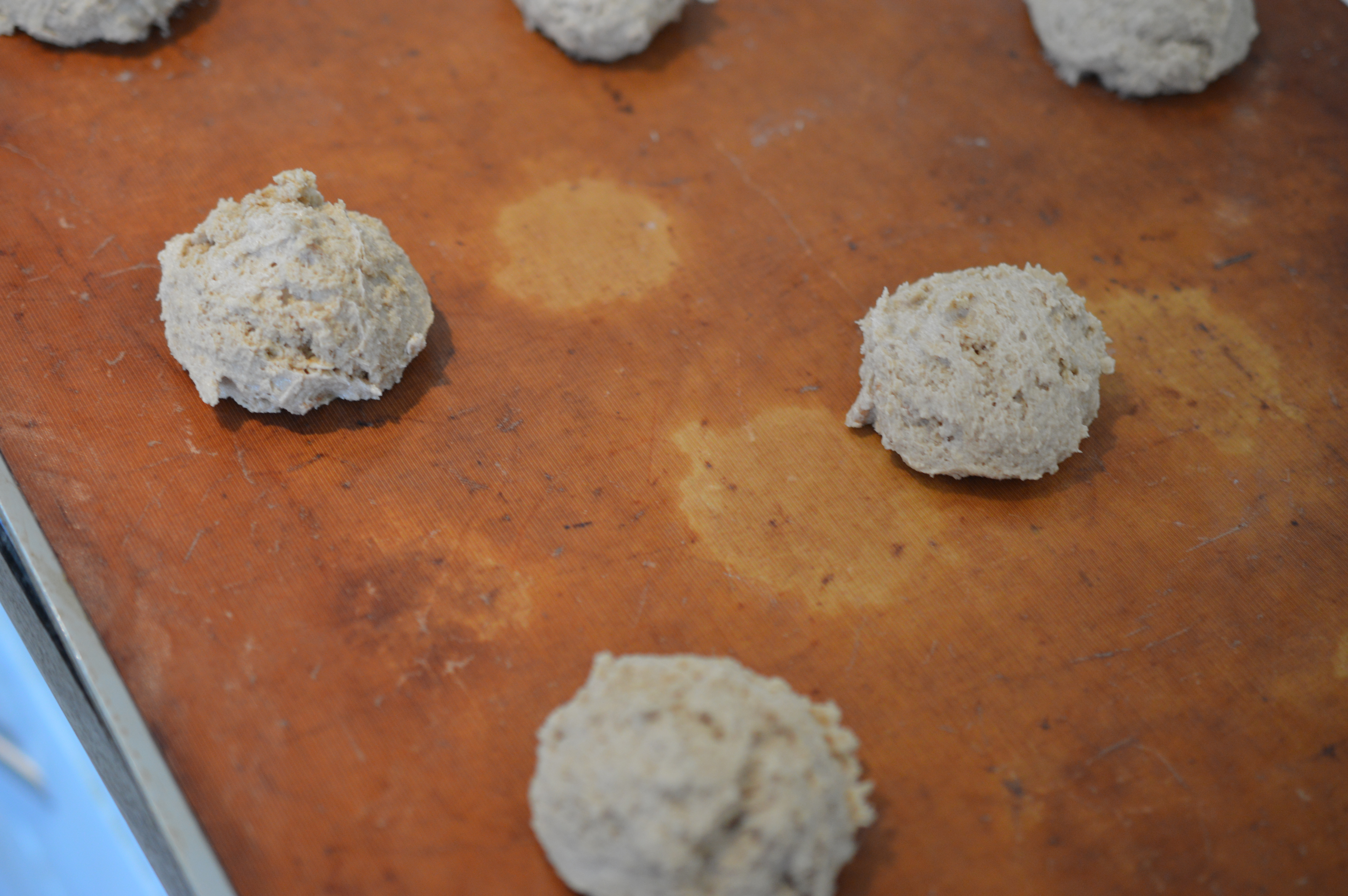 Bake at 175ºC/Gas Mark 3/325ºF for 12 minutes, or until the biscuits spring back to the touch of a finger. (Have you noticed how on TV cooking programmes they always have new baking sheets? Wouldn’t that be nice! Please excuse my much used bake-o-glide.) Allow the biscuits to cool on the baking sheet for 30 minutes or so.