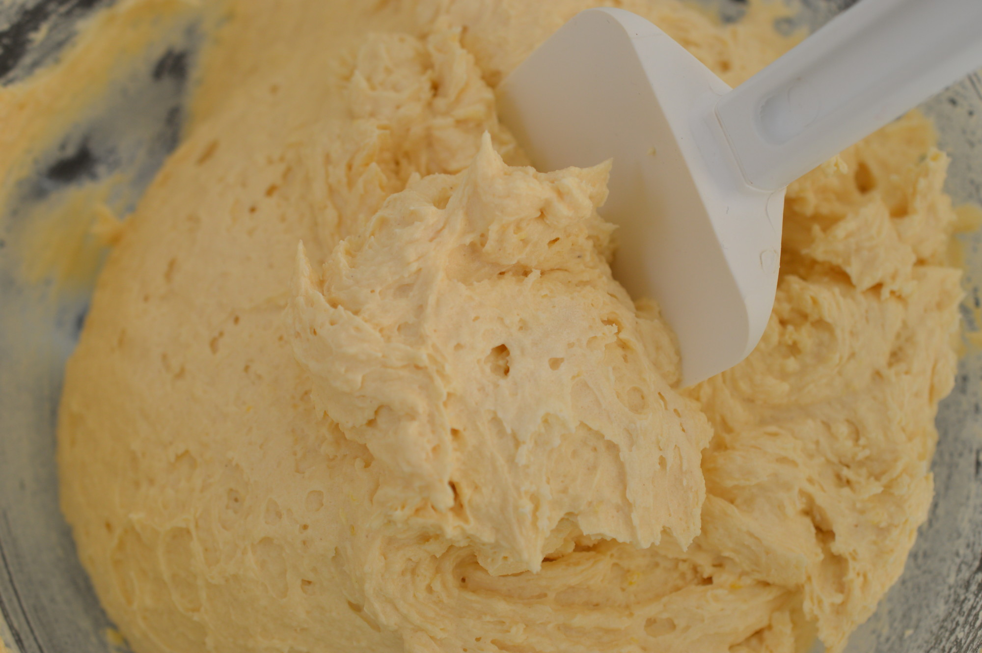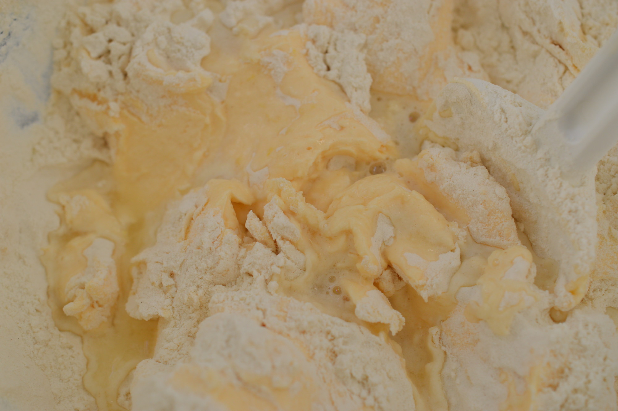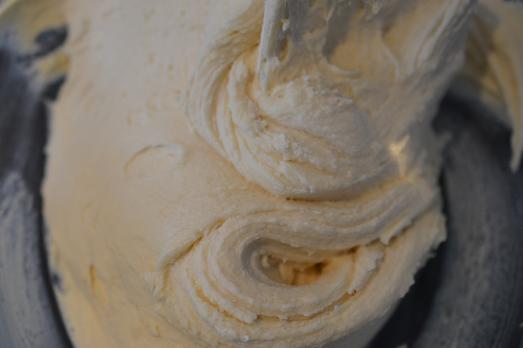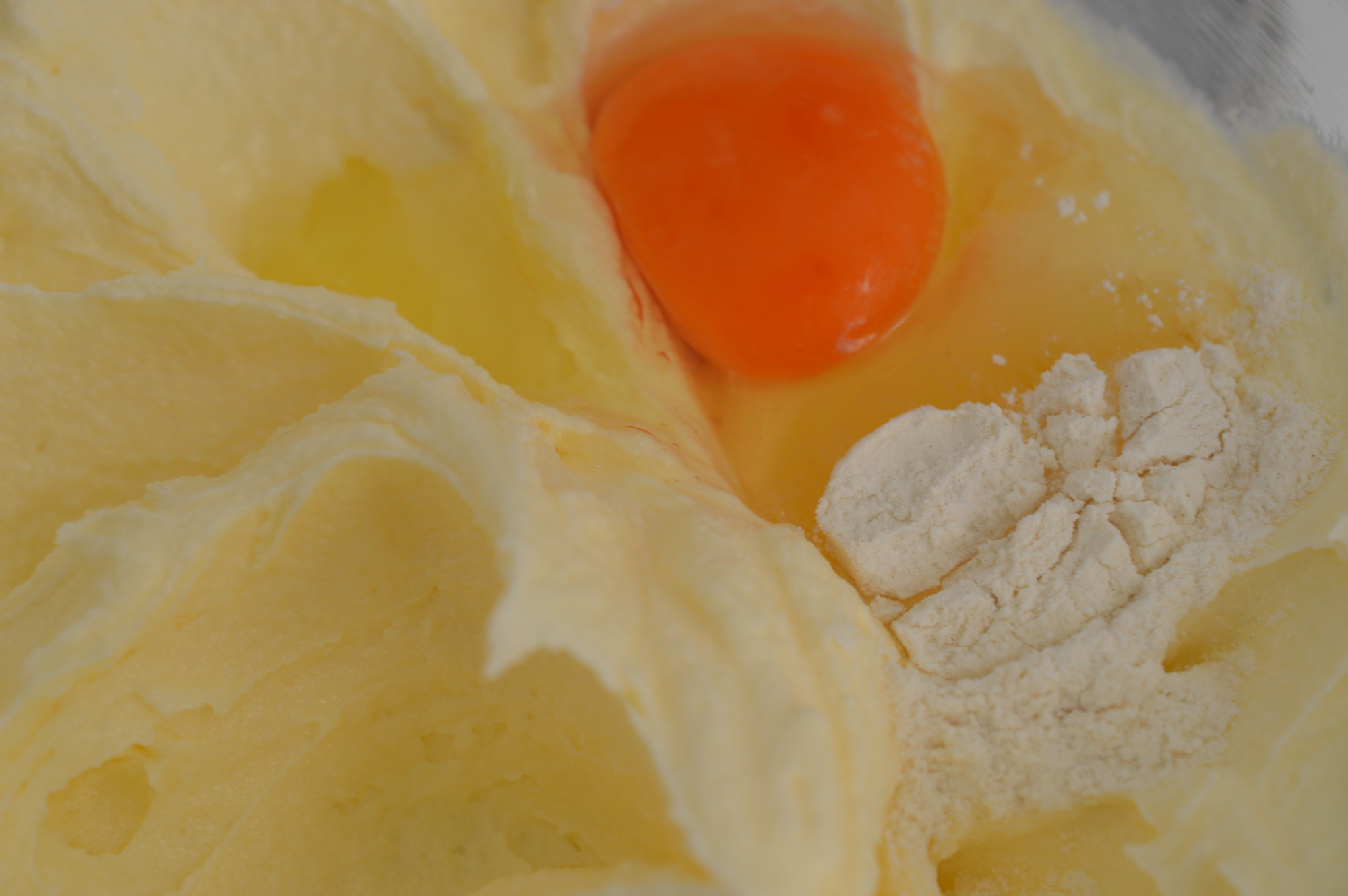 Now the room temperature eggs. Add them one at a time and beat in really thoroughly. A spoonful of the flour will also help stop the mixture curdling. Curdling is best described as a cake batter with cellulite. It happens for a number of reasons – if you add fridge cold eggs, don’t add them singly and/or beat them in enough. You can rescue a curdled mixture by adding more flour and beating it in but your cake will be a little ‘heavier’.
