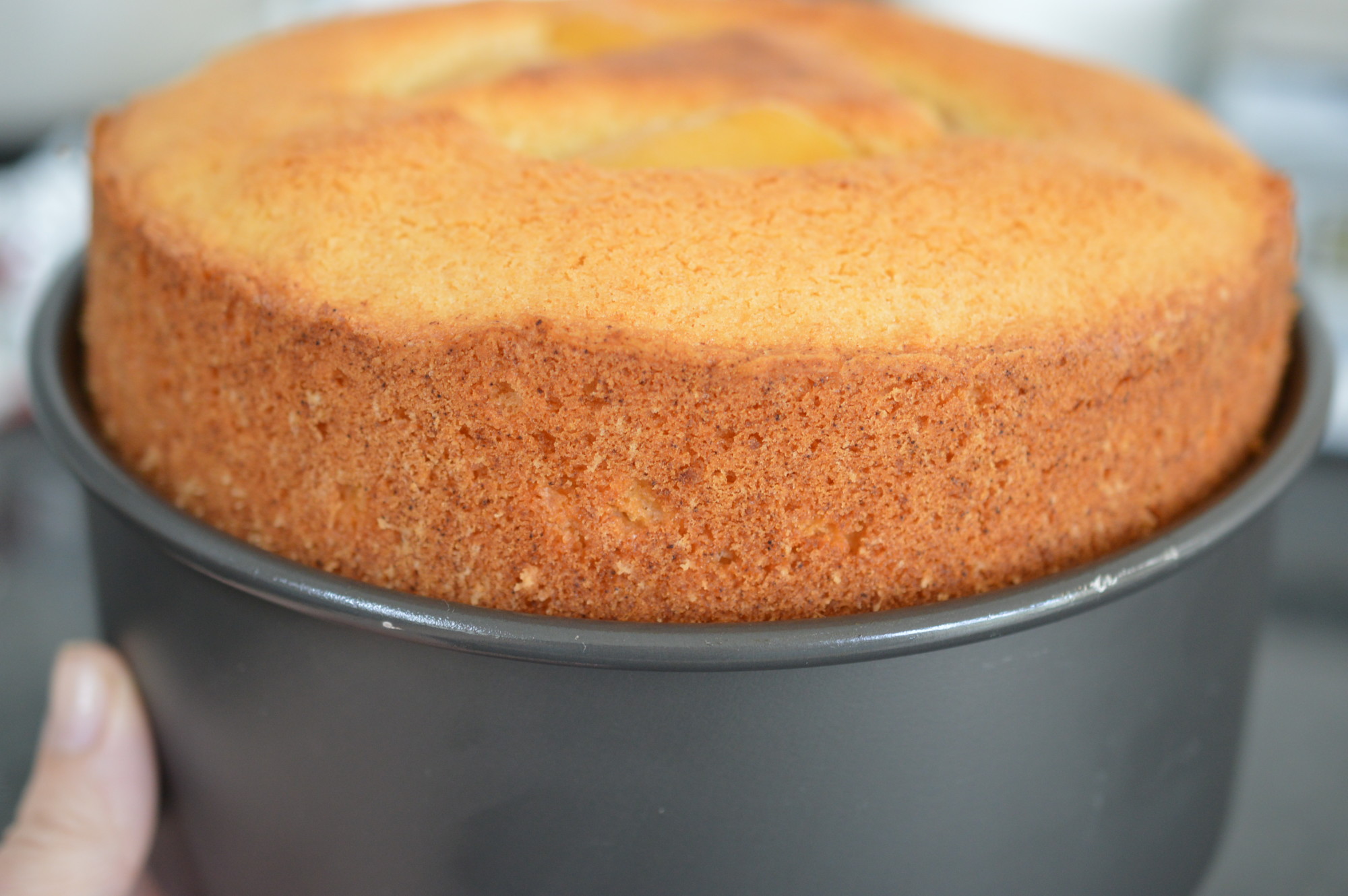 The easiest way to release the cake from the tin is to rest the tin on a can and ease the sides down.