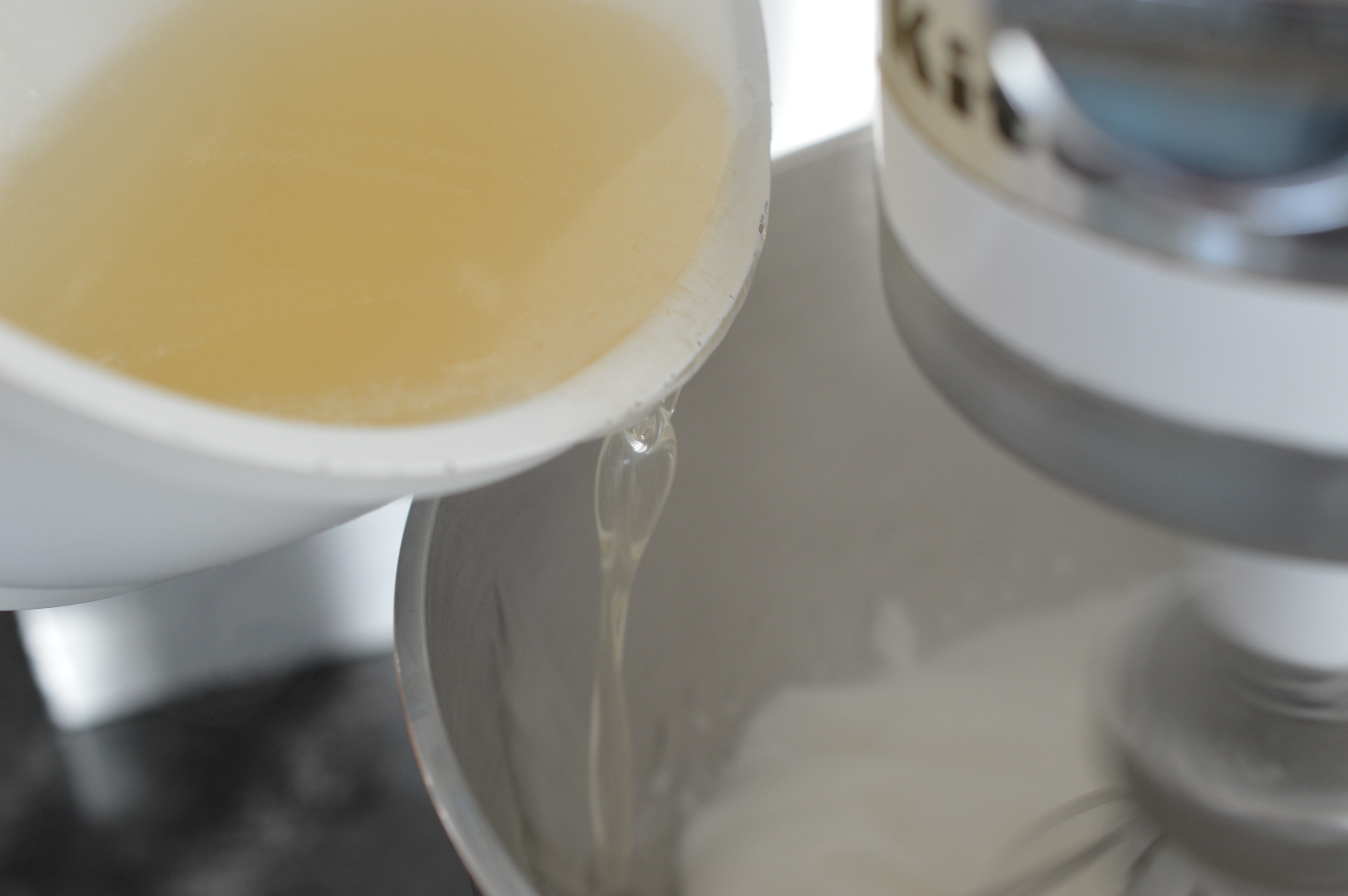 Now add the soaked gelatine – and the water. It will froth. Give it a stir and transfer to something you are happy to pour from. I use a small saucepan but a heatproof jug with a good pouring spout would probably be better.