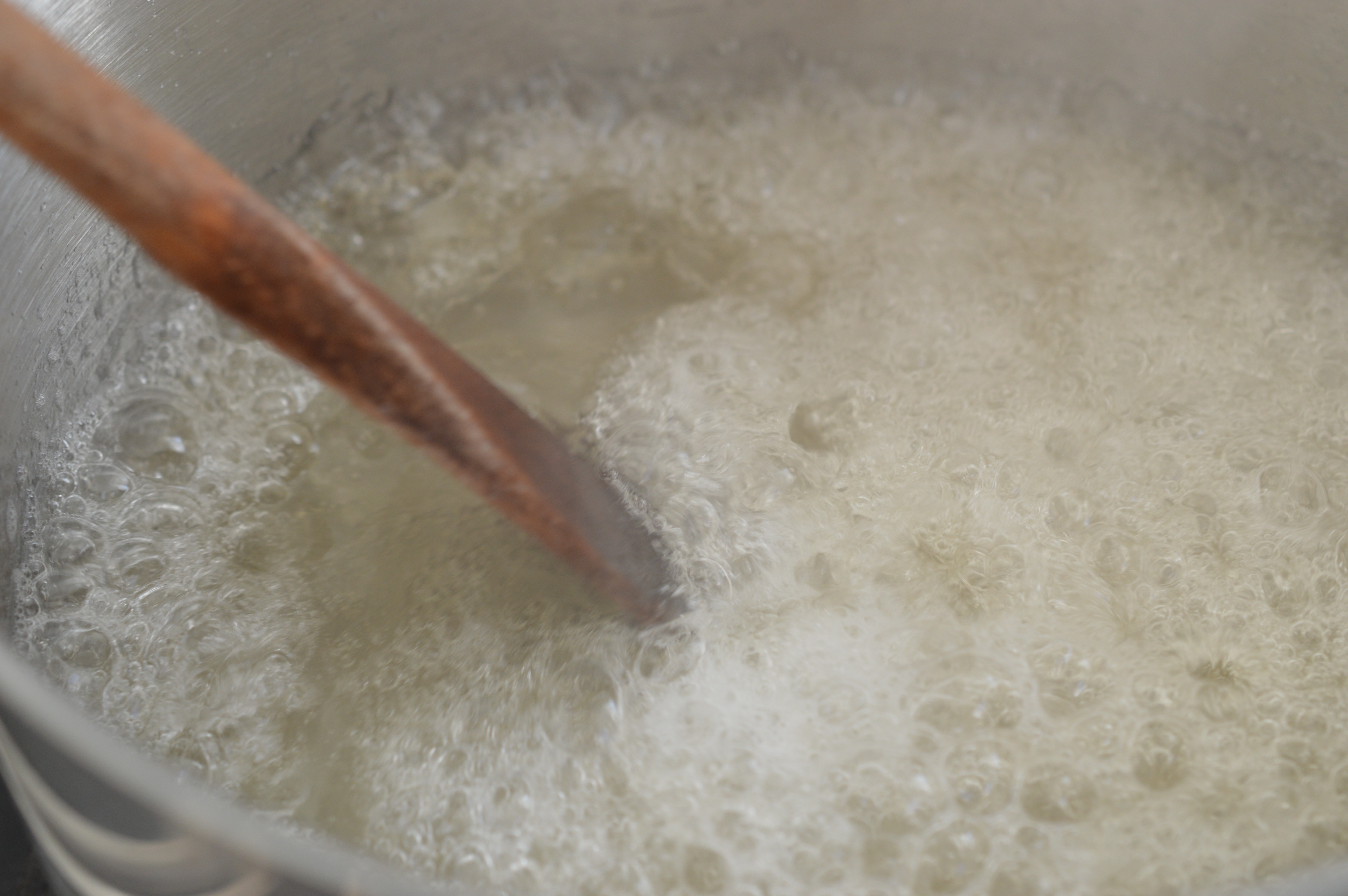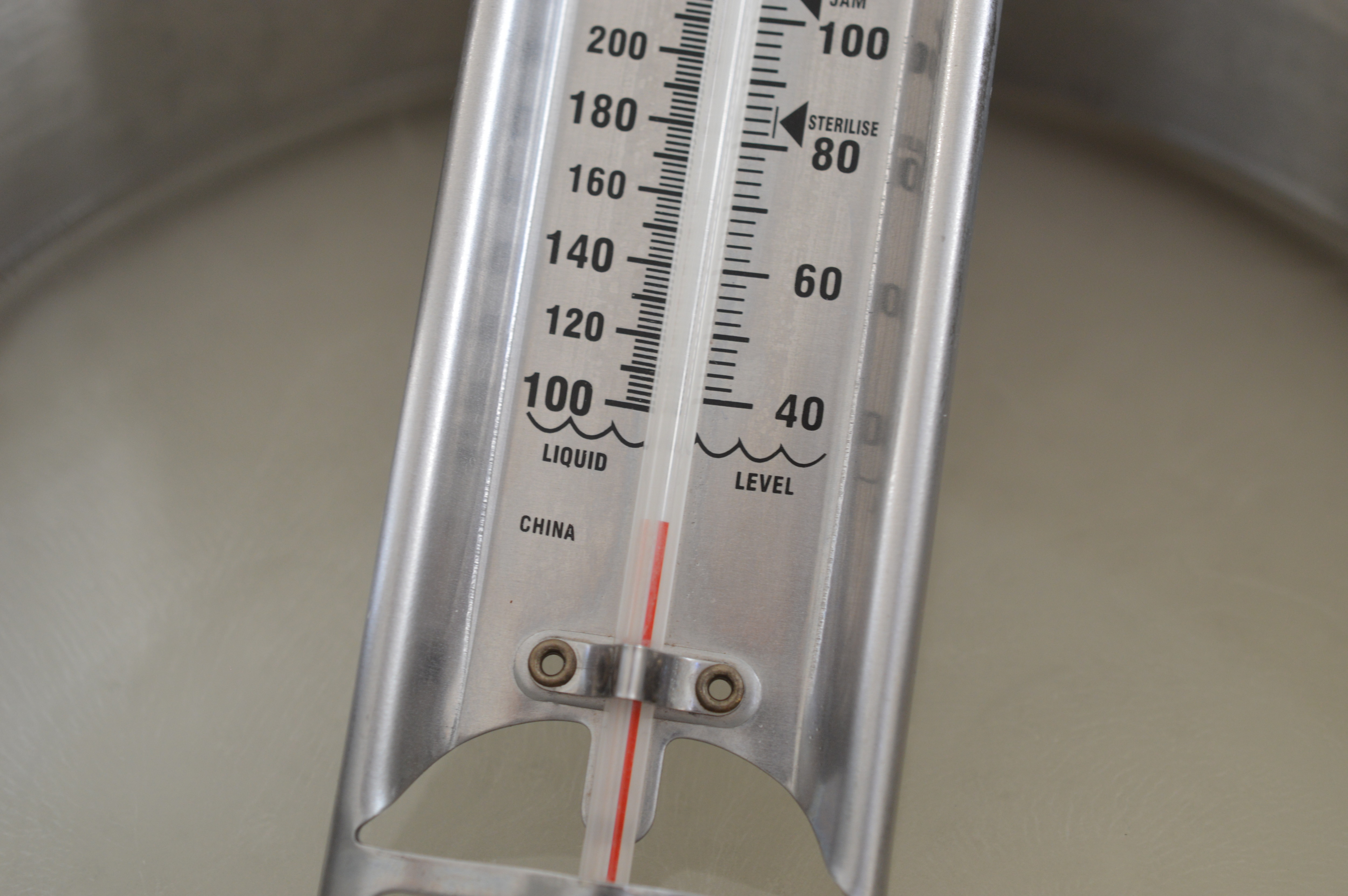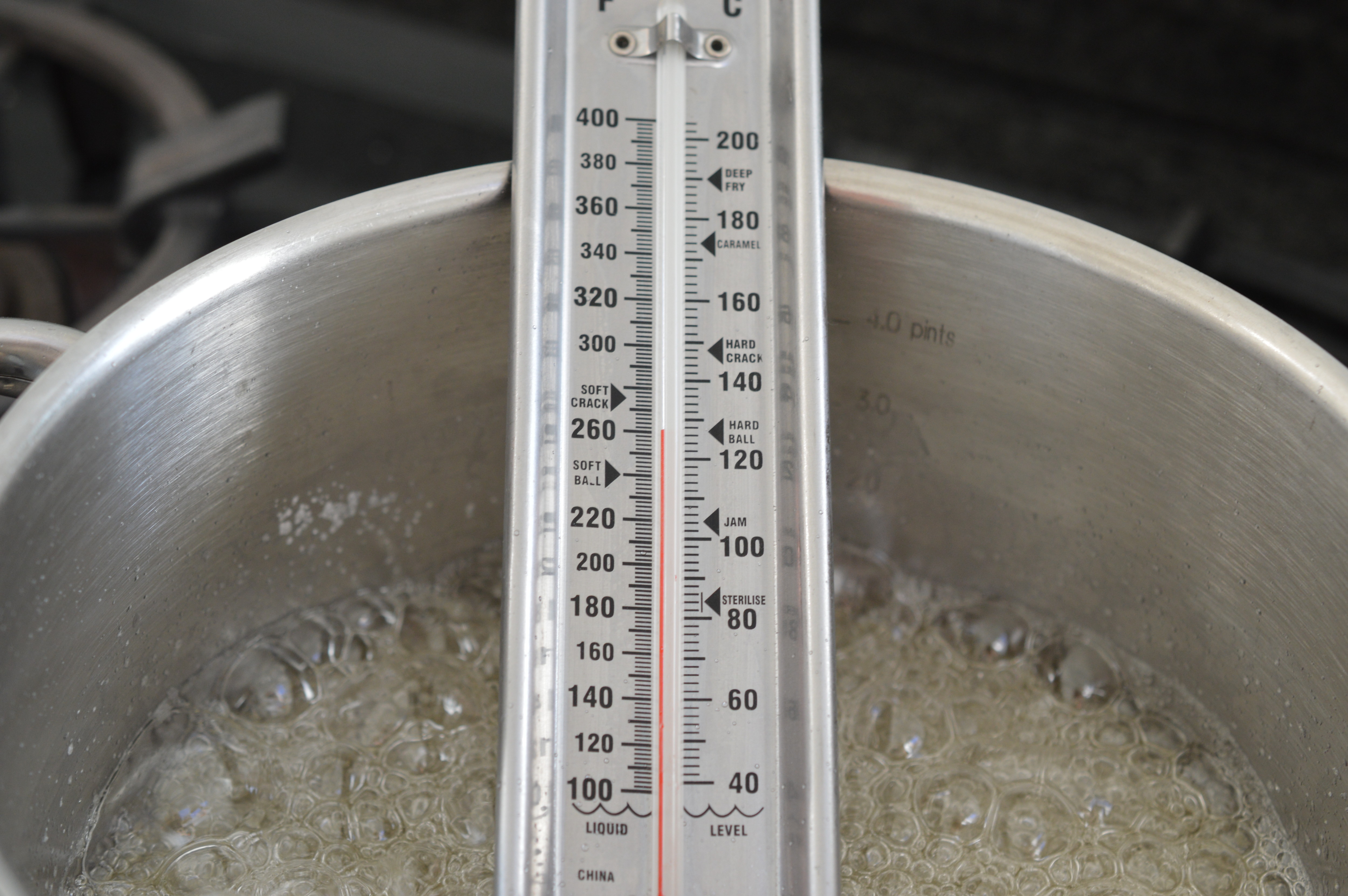 Place 200ml/7 fl oz water in a solid pan, add 455g/1lb granulated sugar and 1 tbsp of liquid glucose. Turn on the heat. What’s happening is that the water is evaporating, the sugar melting and gradually heating to a point which is beyond boiling. Put in a sugar thermometer and wait for it to read a reading of 127ºC/260ºF. It takes a while so be patient.