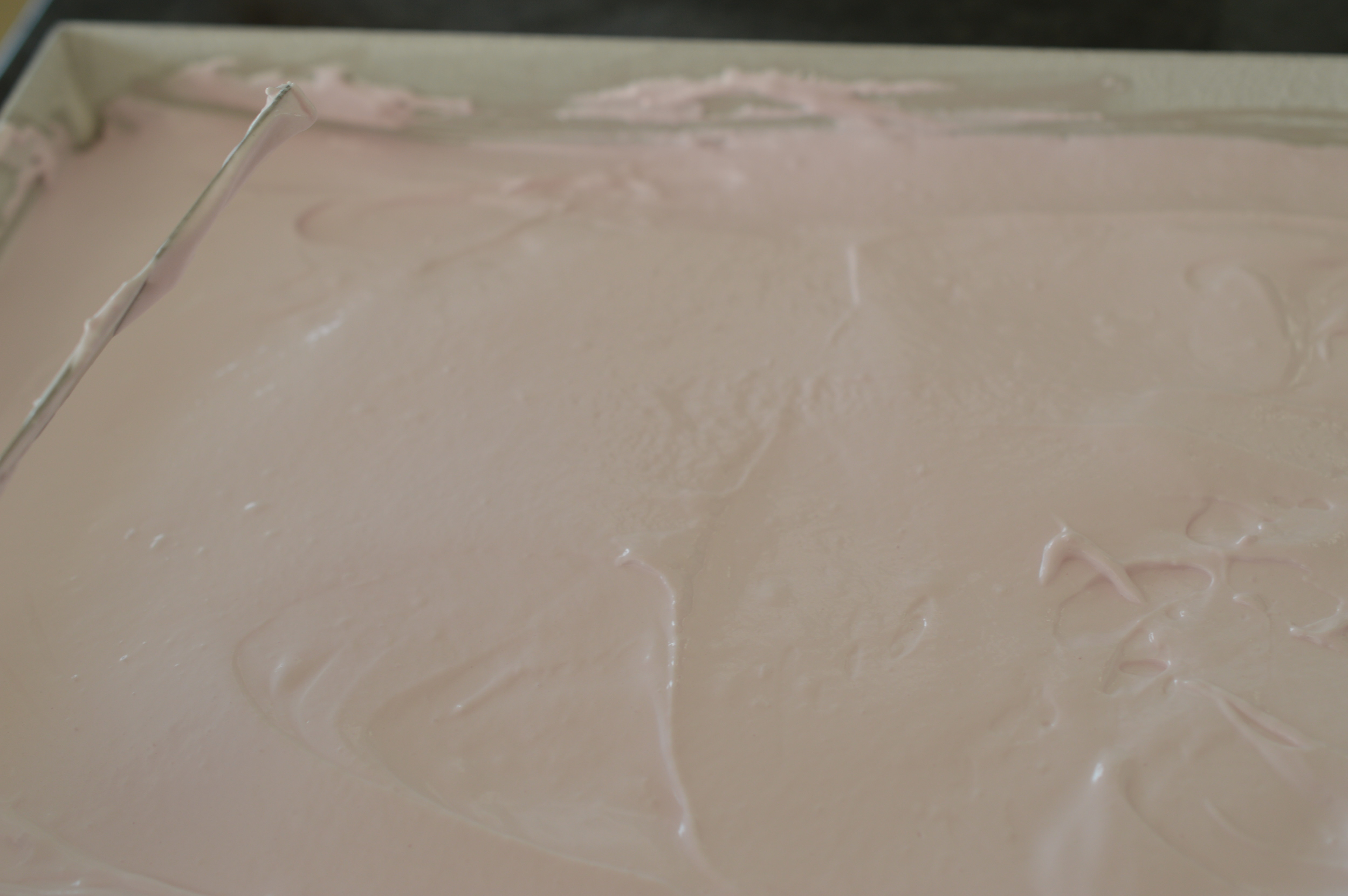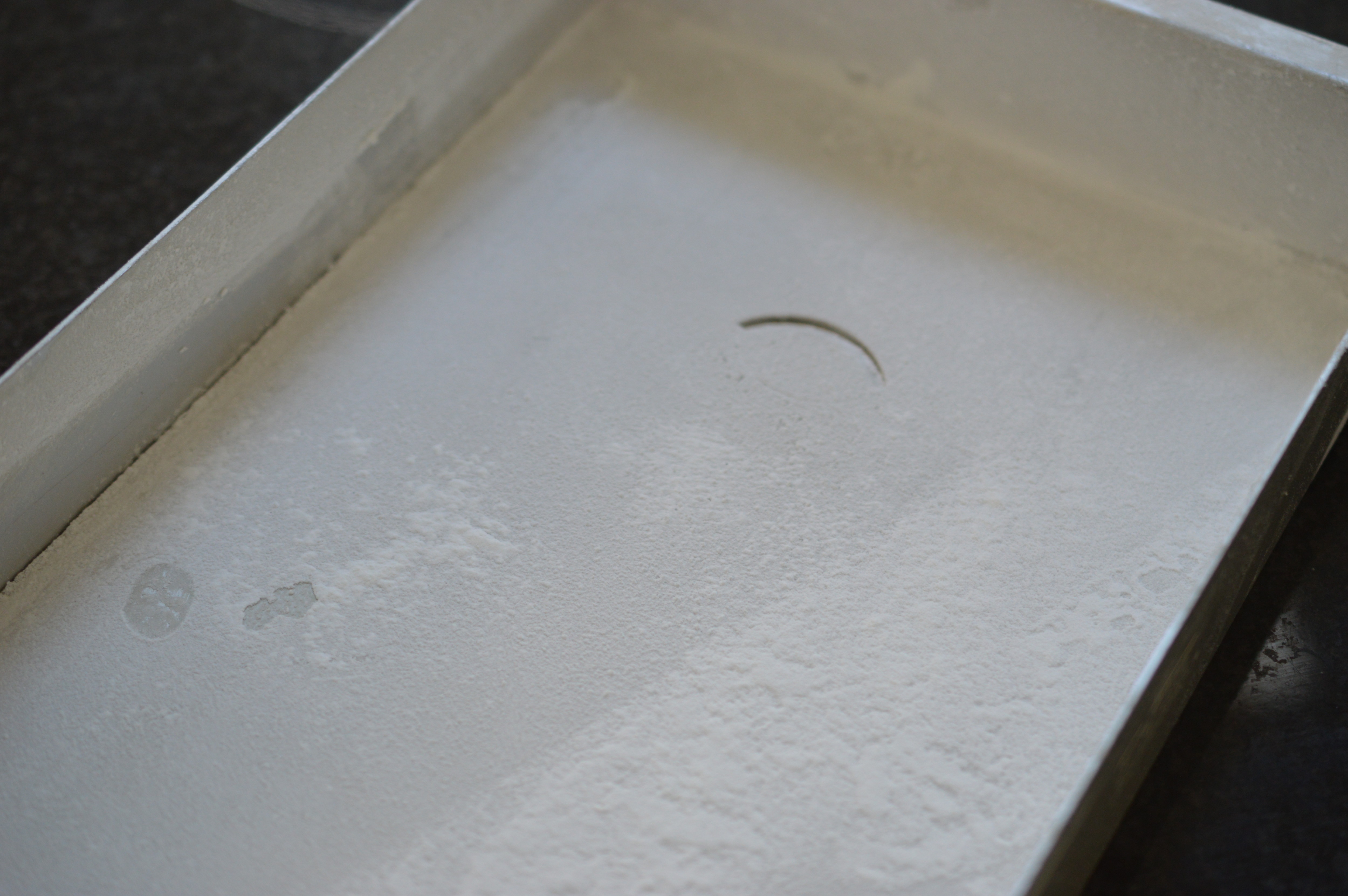 Prepare your tin. You need a shallow baking tray which measures 30cm x 20cm (12″ x 8″). Lightly grease with a flavourless oil and then dust with icing sugar and cornflour. The cornflour is there to dry out the marshmallow so don’t be stingy.
