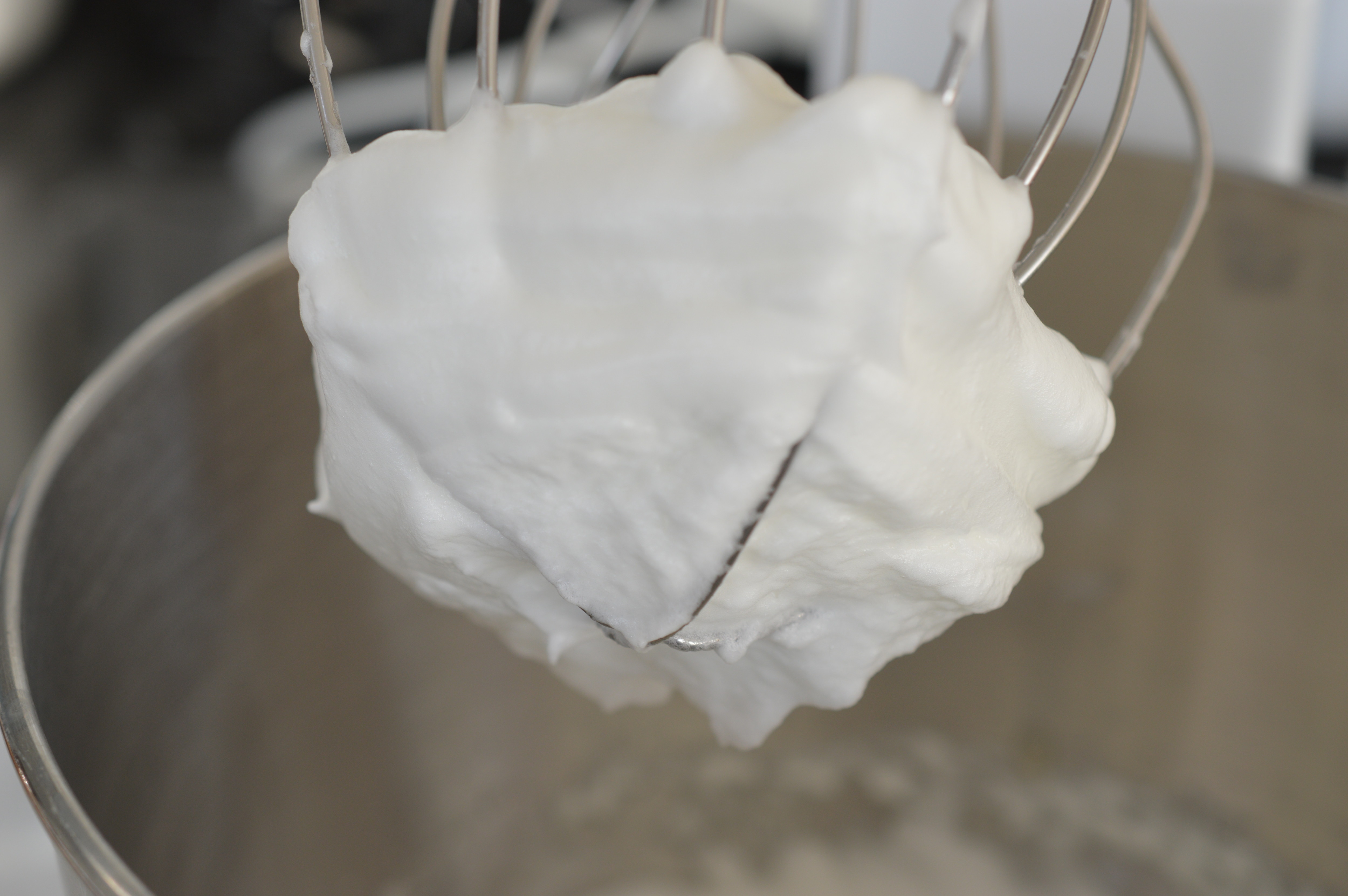 With the mixer continuing to beat the egg whites, add the hot syrup in a steady stream. Continue beating for 10 minutes until smooth and glossy.