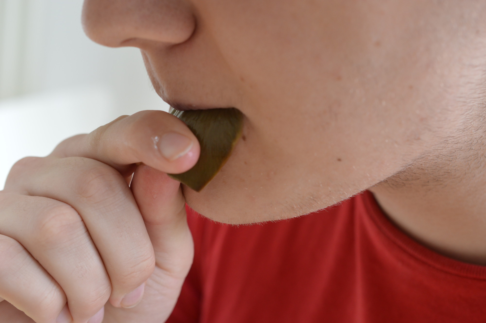 Start at the bottom of the artichoke and pull a leaf off.  The base is ‘fleshy’.  Dip it in your sauce, flip it over and use your bottom teeth to scrape that bit off.