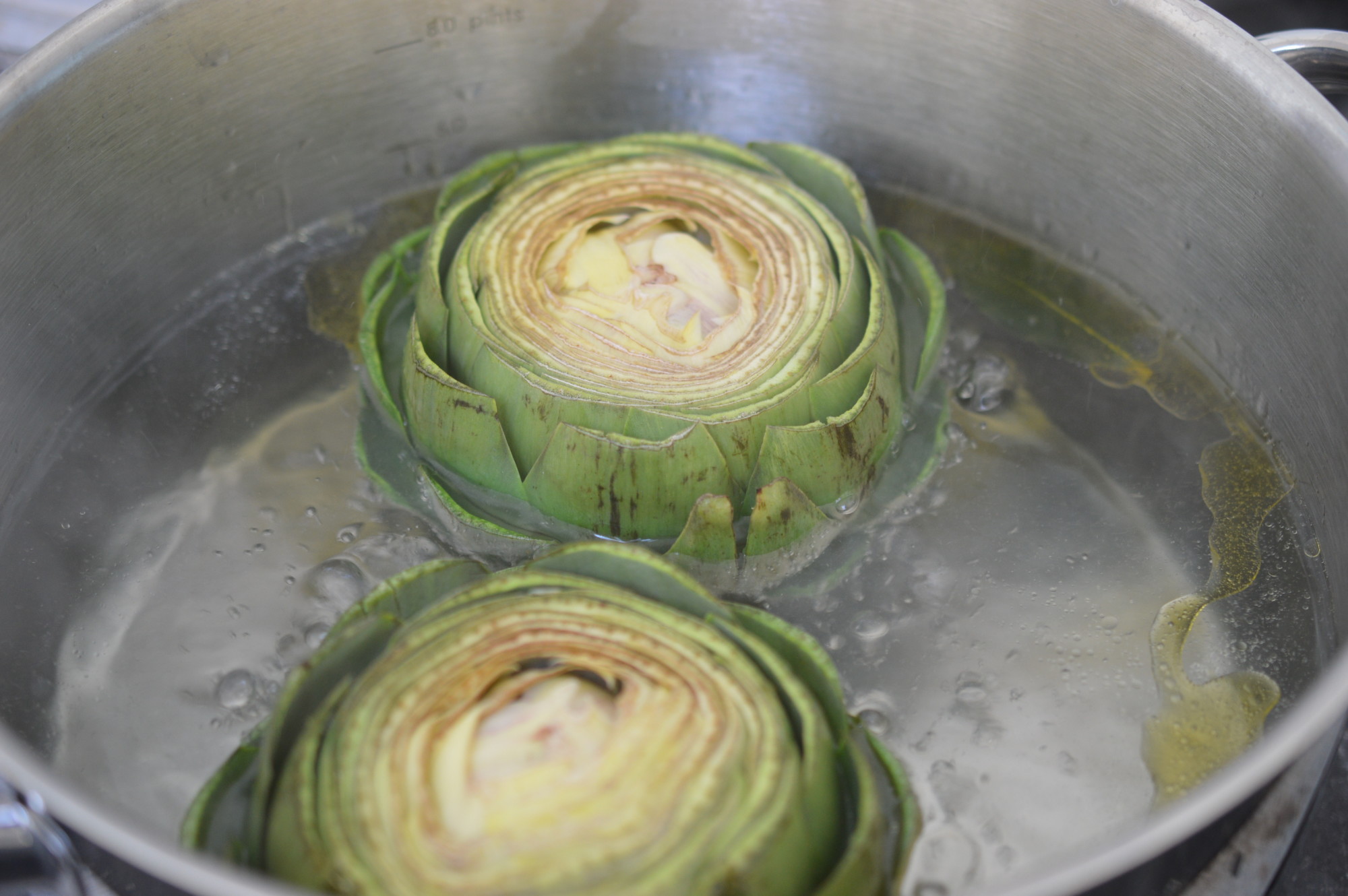 Put some water on to boil.  This is for the court bouillon (flavoured cooking water).  You need a stainless steel pan with a lid which will comfortably, but snugly, hold your artichokes and use enough water to cover them.