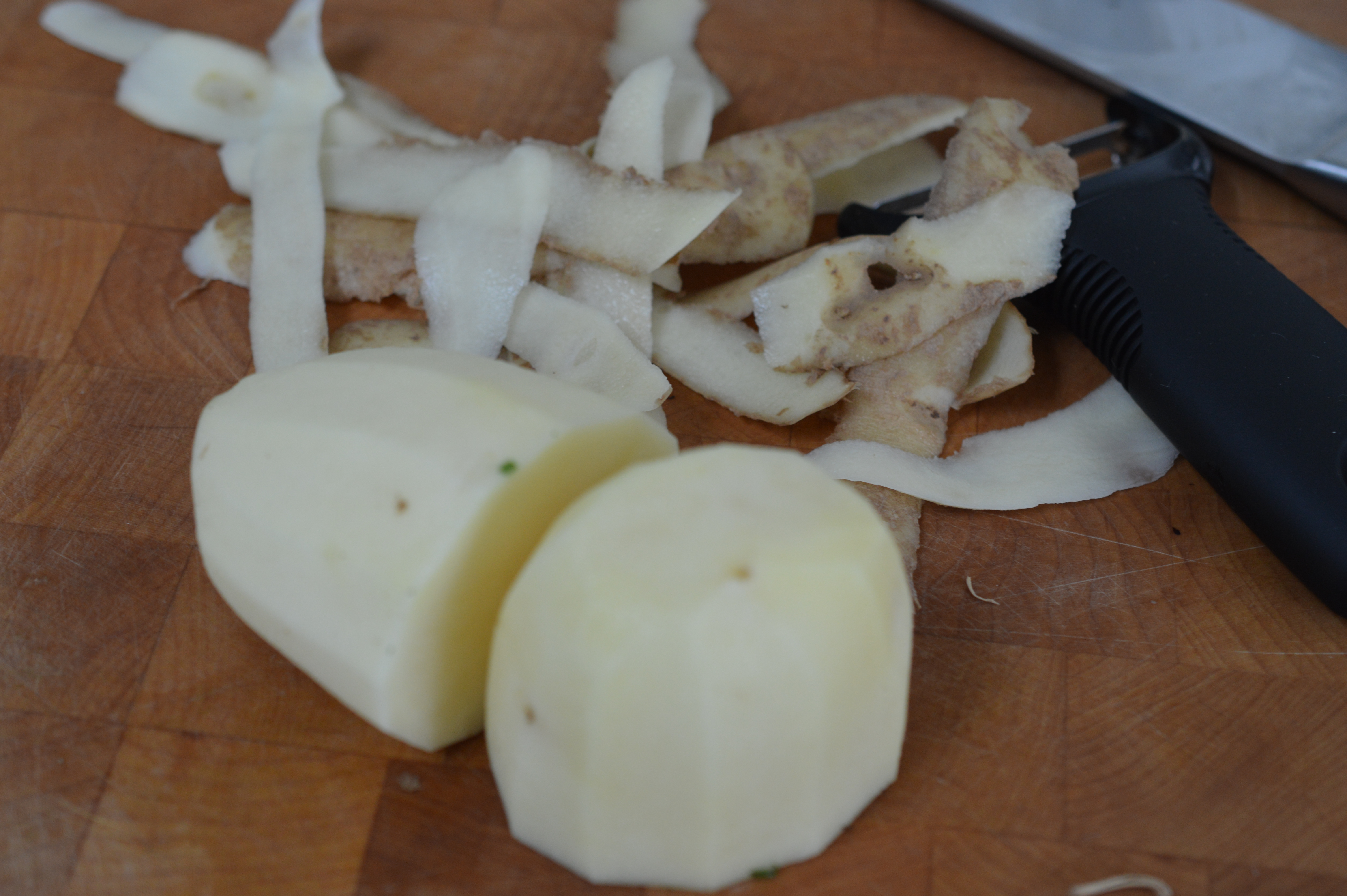 You need a ‘floury’ potato to get a ‘fluffy’ mash. Waxy potatoes get a bit ‘gluey’ so I’m not in favour of the 50/50 mix approach. I’m using Maris Pipers. Wash, peel and cut them into even-ish pieces so they’ll cook in roughly the same time. They go into a saucepan filled with cold salted water. That’s important. If you put potatoes into boiling water the outside is ready before the inside has cooked. Since the potato will absorb water you’ll end up with soggy potato and that’s revolting. No amount of butter will put that right.