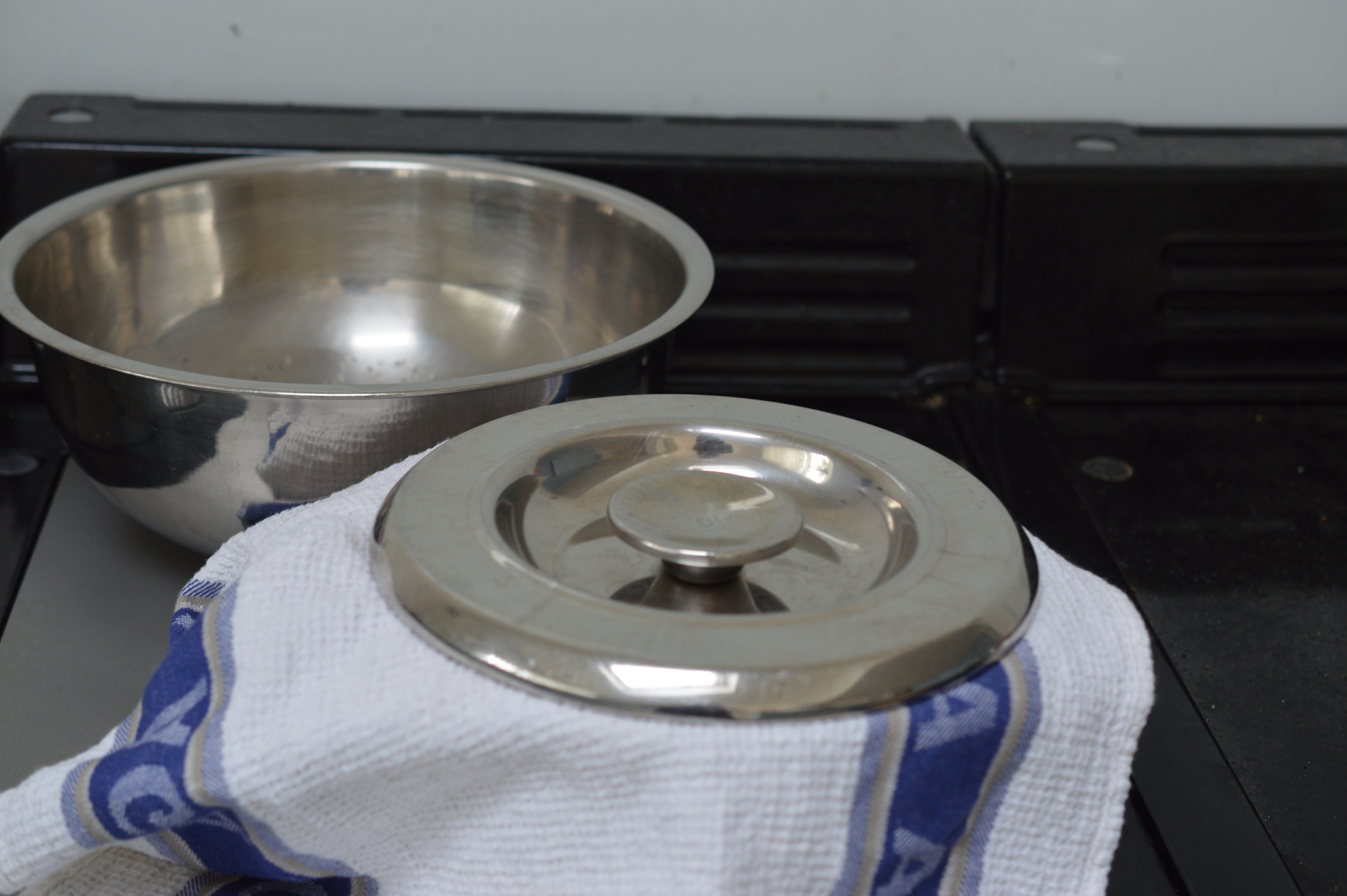 Meanwhile, warm the milk in a saucepan. (Or, if you’re me – in a bowl on the Warming Plate). You don’t want to bring the temperature of the potatoes down by adding cold milk. For my 1kg of potatoes, I used 50g of unsalted butter and 150ml of full-fat milk.