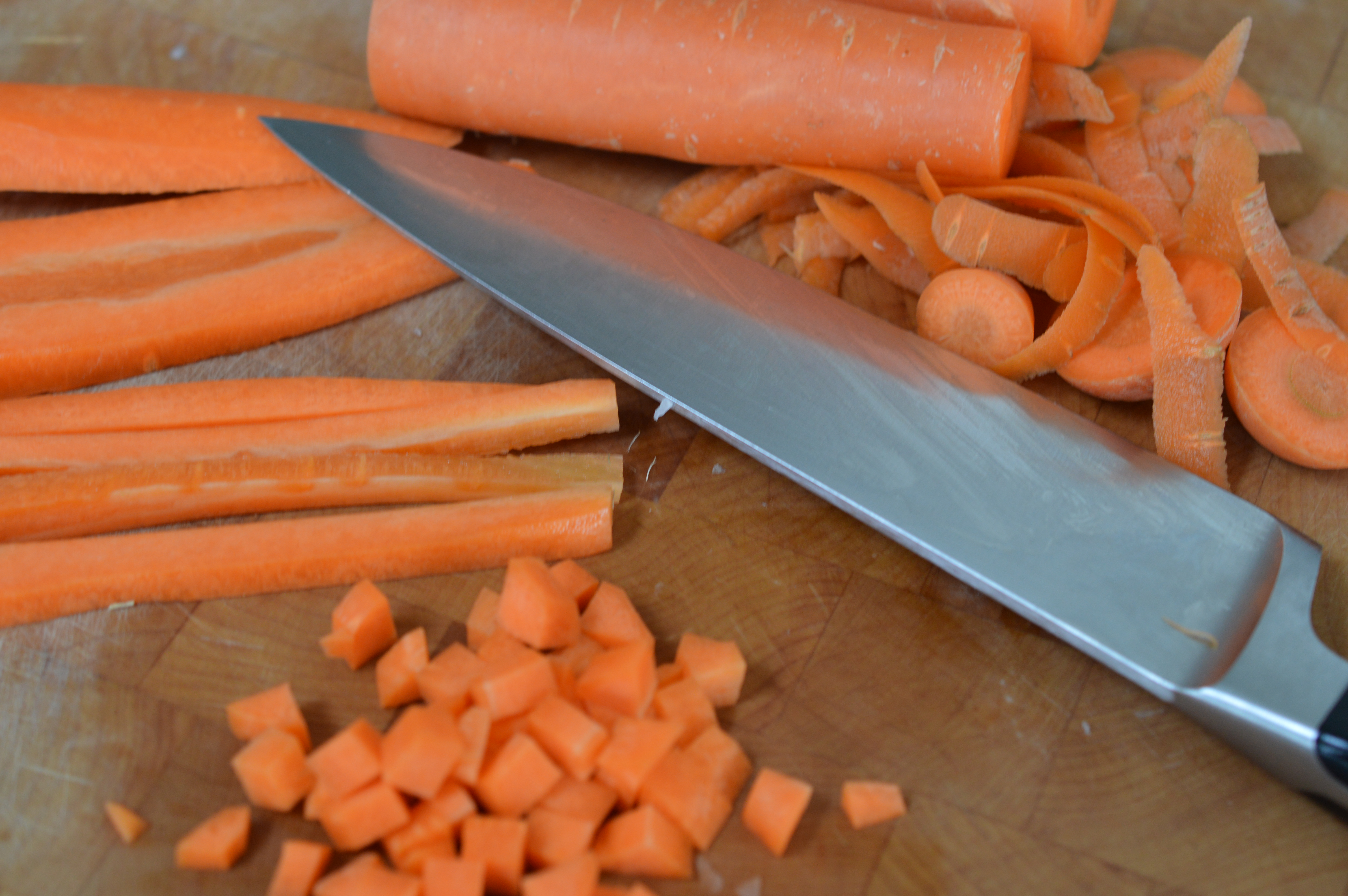 Add a little beef dripping, if you have it – or rapeseed oil – to the residual meat fat in the frying pan and, over a low heat, gently fry the onions. You’re looking for them to soften, but not colour. Keep an eye on it while you get on with prepping the rest of the vegetables. Turn off the heat as soon as they are ready. (If you cook on an Aga – put the onions in your Simmering Oven and entirely forget about them until you’ve done all your chopping. I love my cooker.)