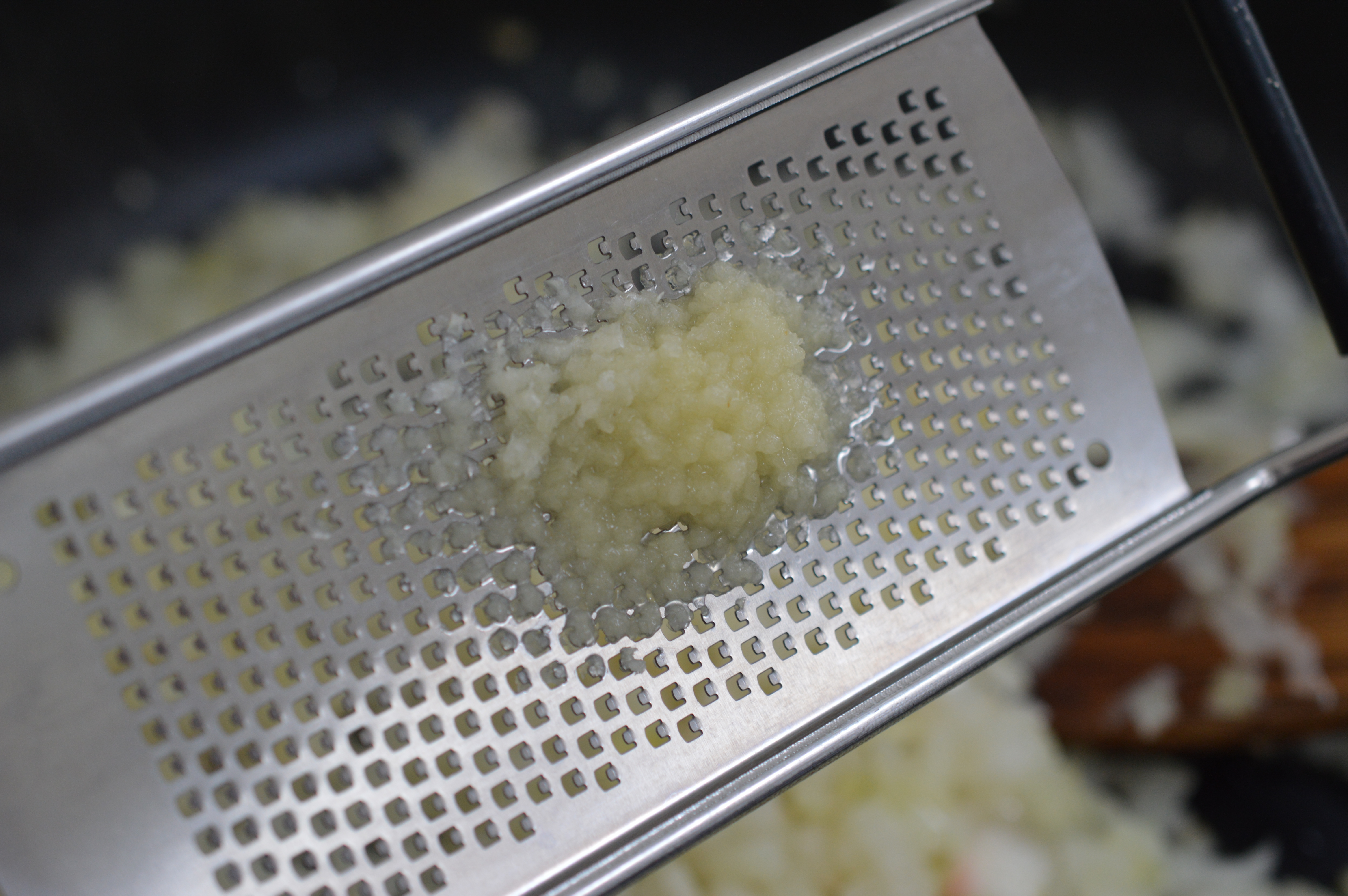 Garlic. A contentious addition it seems, but I like it. I use a microplane grater so I have the garlic evenly distributed through the onion. Turn the heat back on and give the onion and garlic a stir.