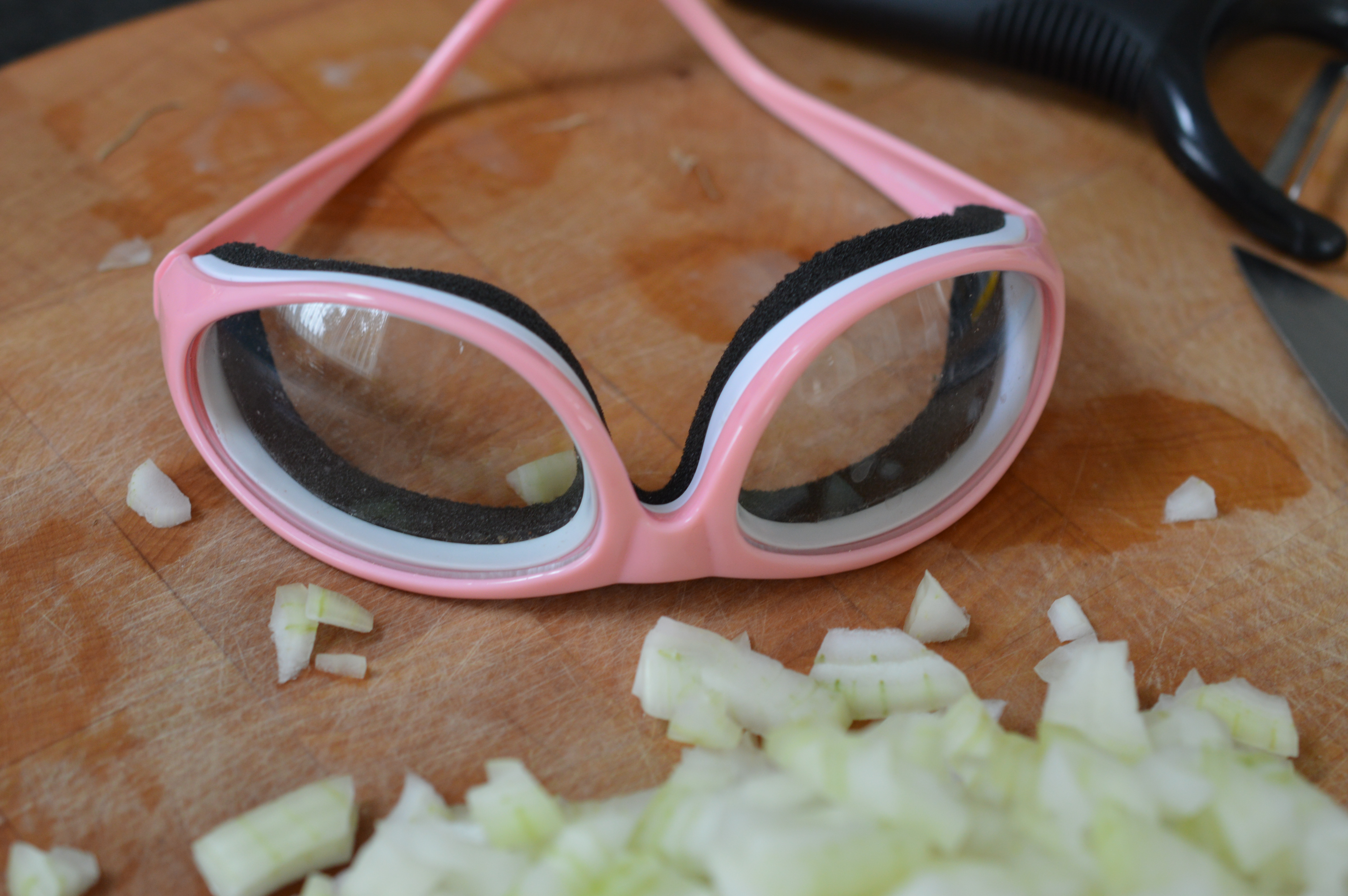 I absolutely love my onion goggles. They were a Christmas present from Jem, who is offspring 4. Brilliant! I may look idiotic, but it’s a price I’m prepared to pay. (Clearly I have an ‘average’ sized head and I don’t wear glasses …) If that’s not you, you might like to try freezing your onions for ten minutes before you start cutting. Apparently it’s effective and would certainly be safer than trying to chop under water.