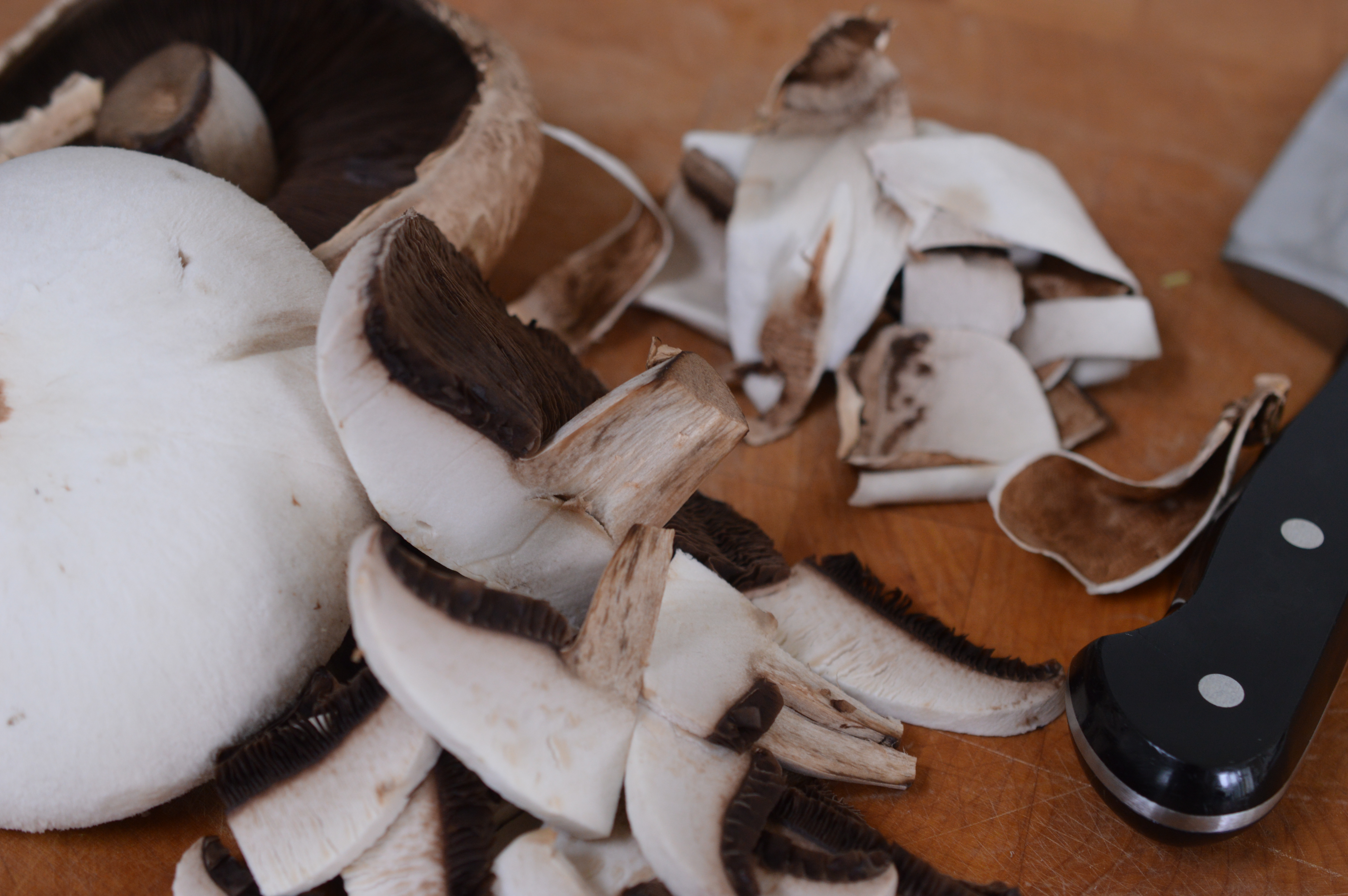 Mushrooms, sliced. I had three big flat field mushrooms, so they were peeled too. Little mushrooms don’t need to be. Brush off the dirt. Don’t wash them.