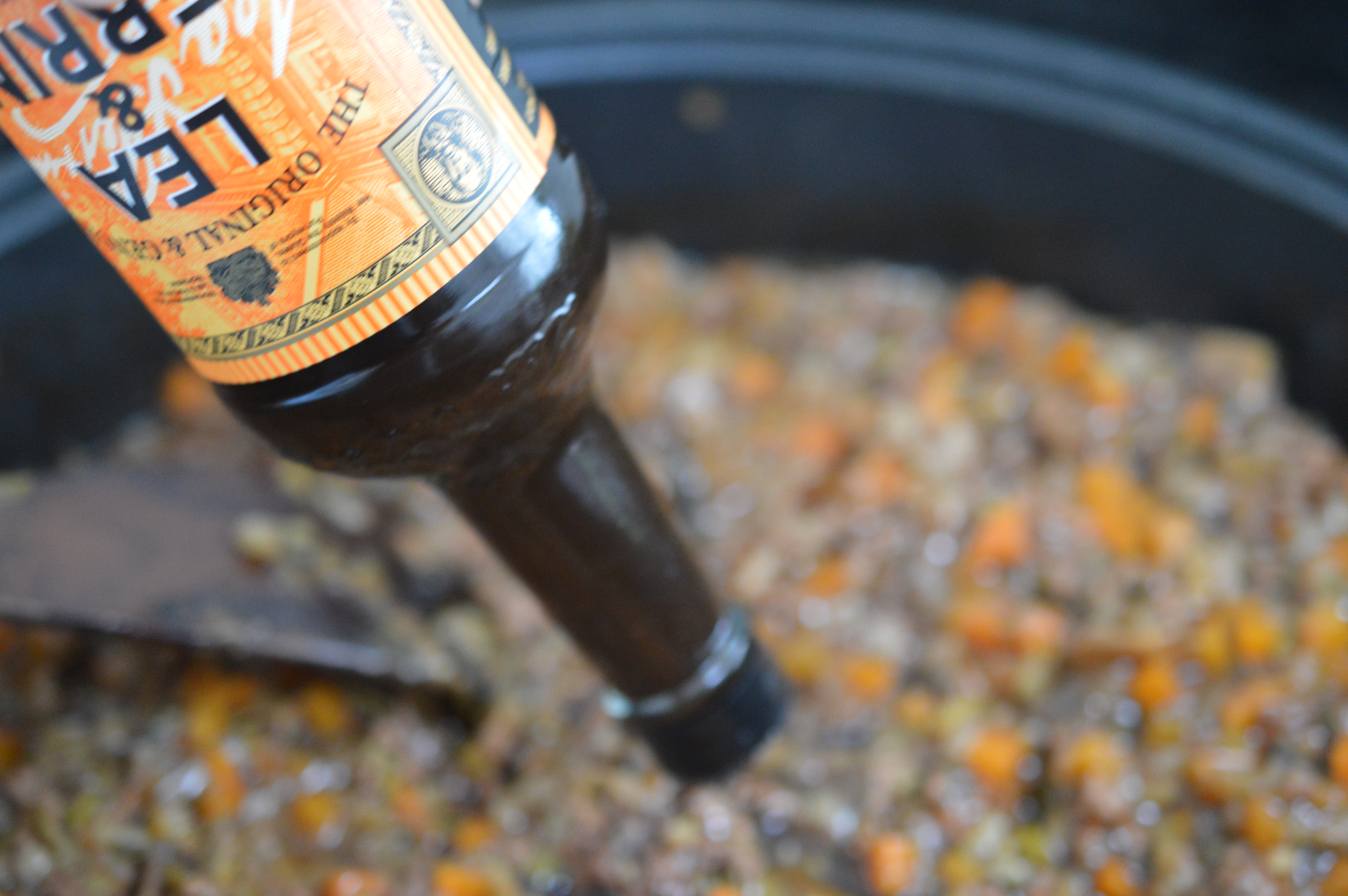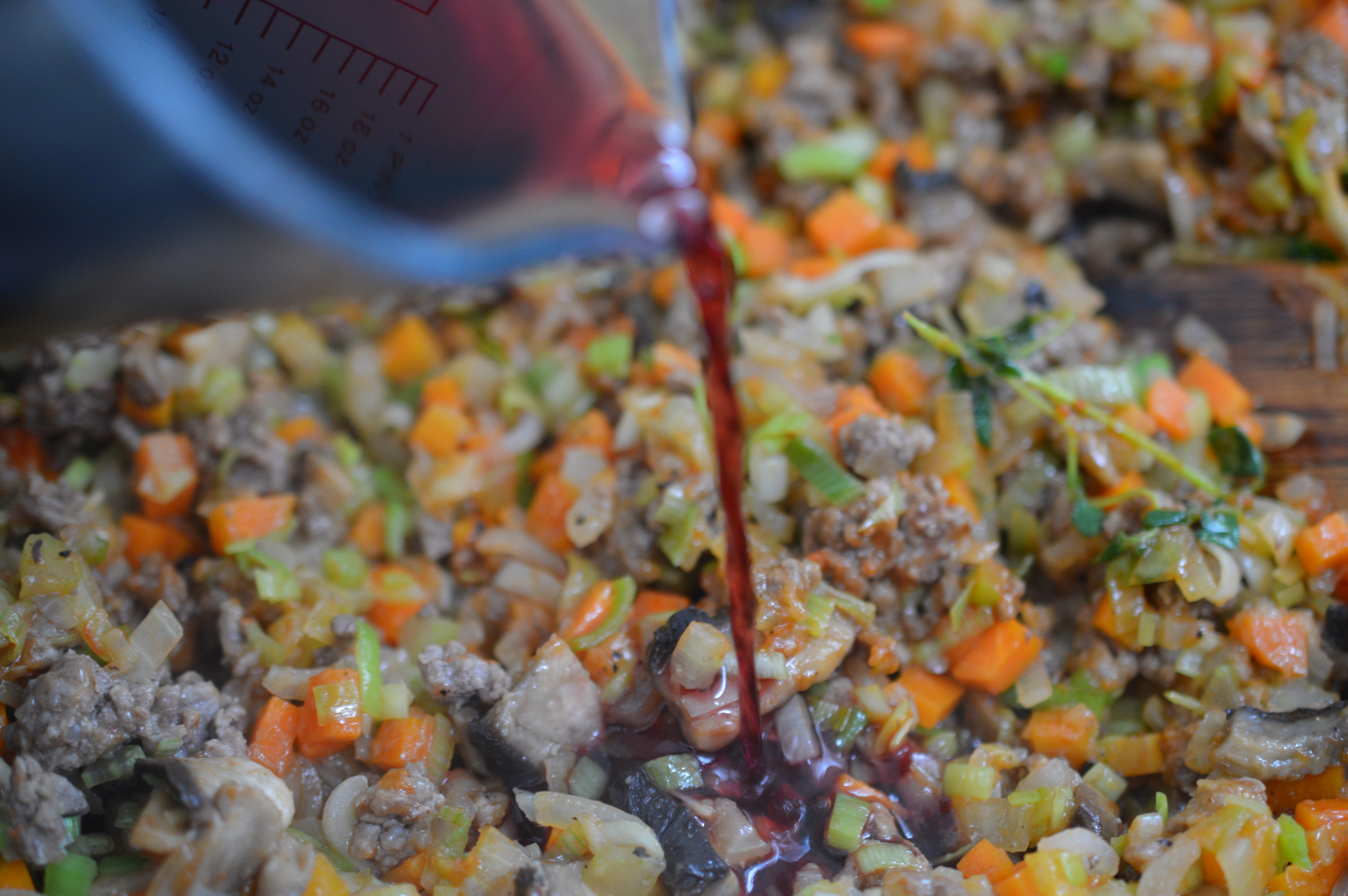 Nearly there. It’s now time to add some liquid. This could quite easily be water, but I had some red wine left over from last night and used a mixture of the two. You want the mixture to be loose.
